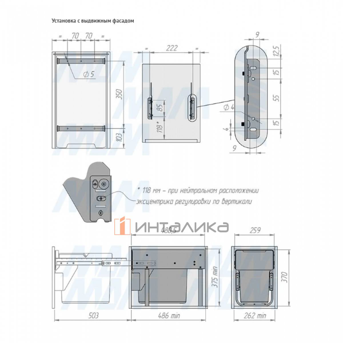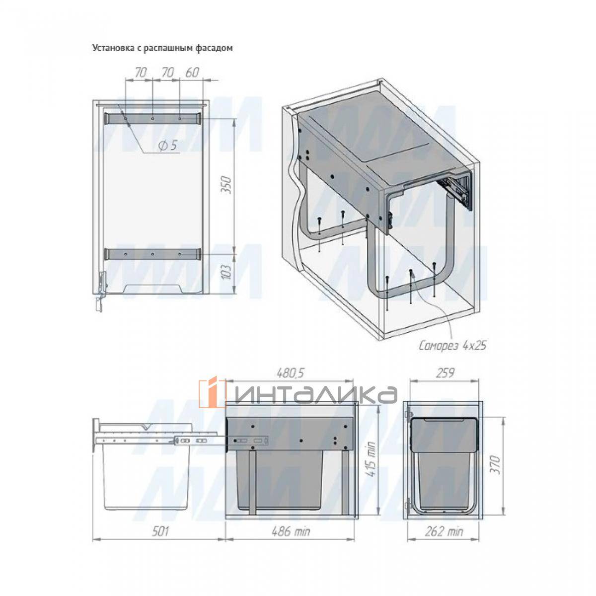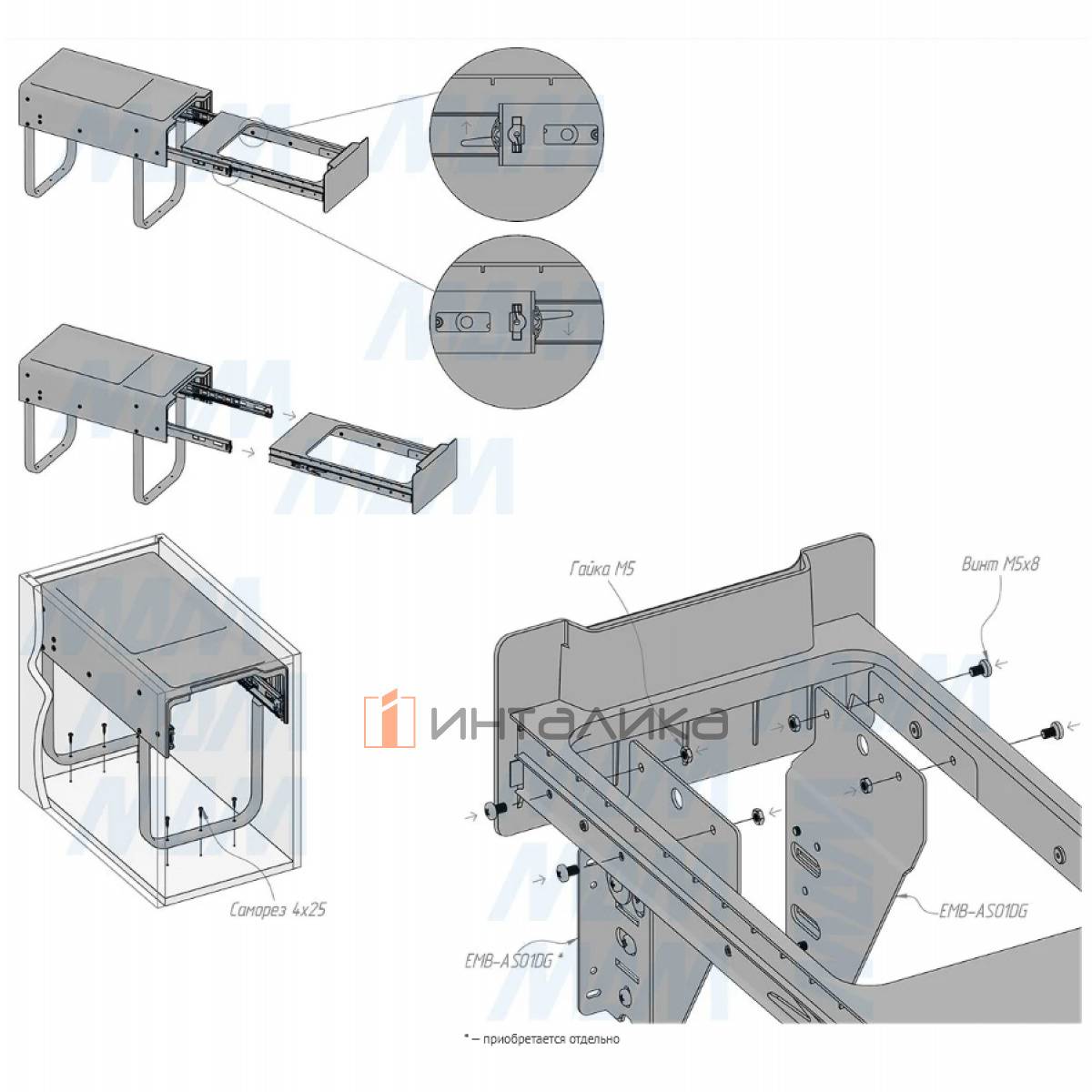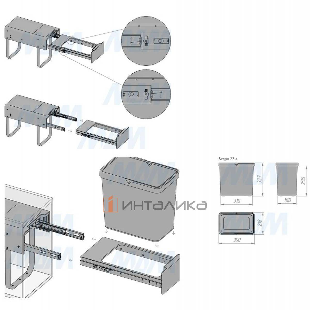 Комплектация: рама с выдвижной частью (в сборе) — 1 шт., ведро с ручкой (в сборе) — 1 шт., установочный крепёж для рамы — 1 компл.