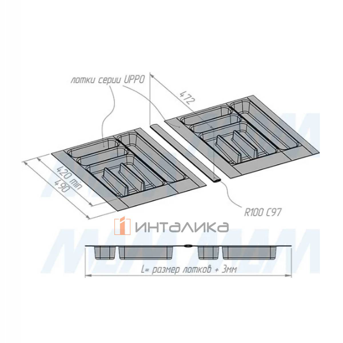 Применение: специальный элемент, который позволяет объединить два или более лотка для столовых приборов в единую конструкцию для широких ящиков