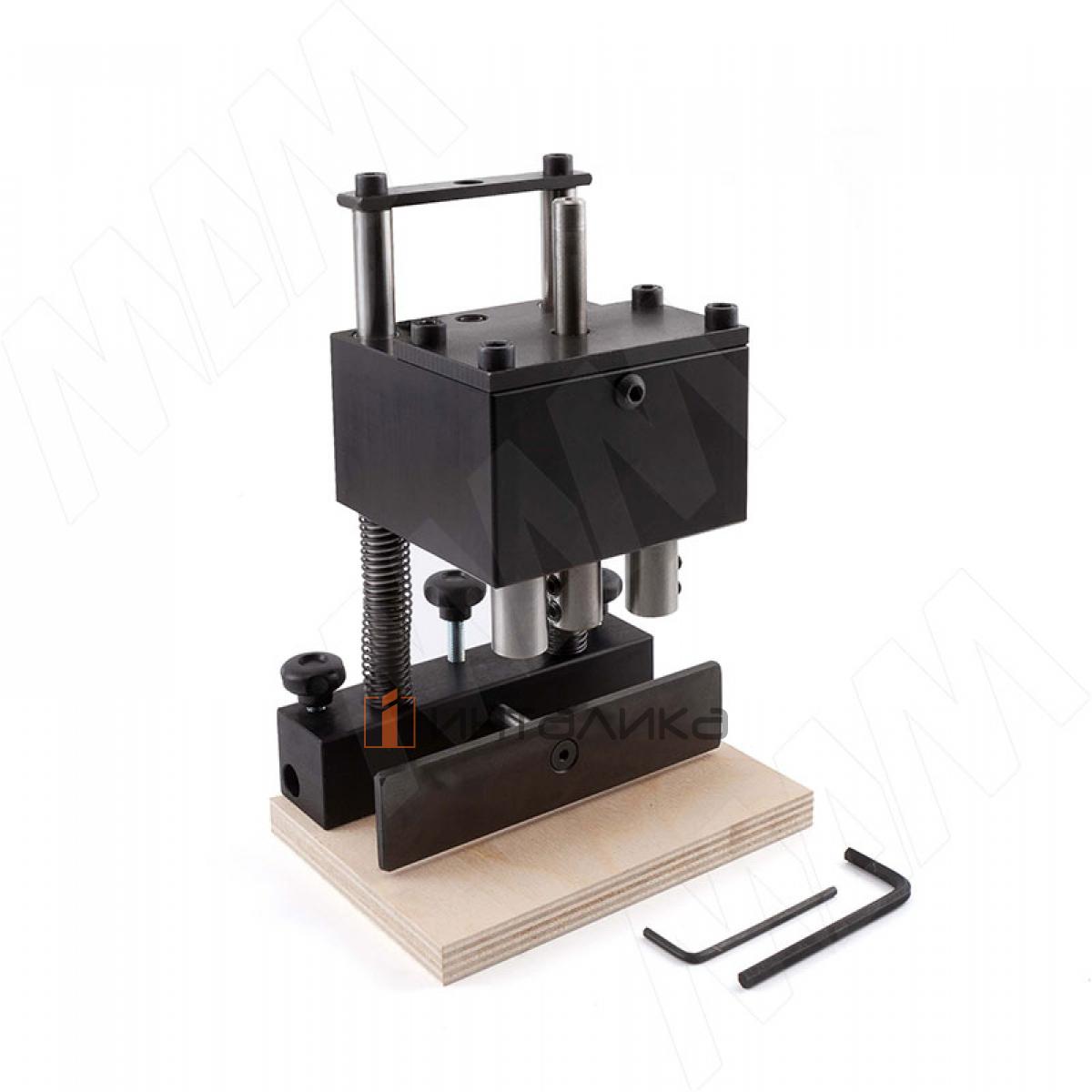 С его помощью, используя ручную электрическую дрель, дрель со стойкой или обычный сверлильно-присадочный станок за один проход можно просверлить три отверстия для крепления петли.
