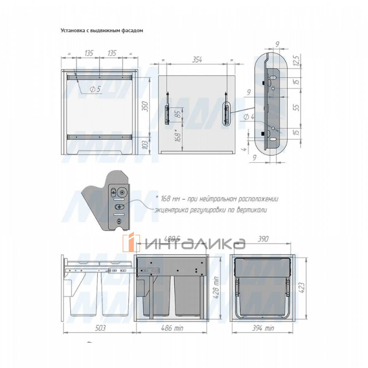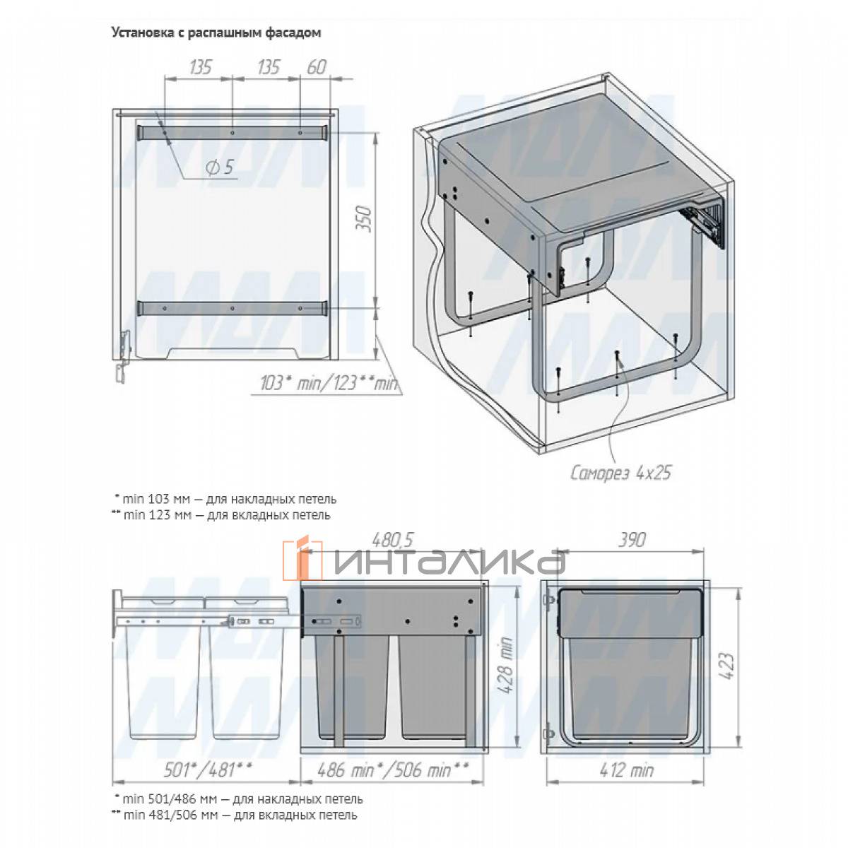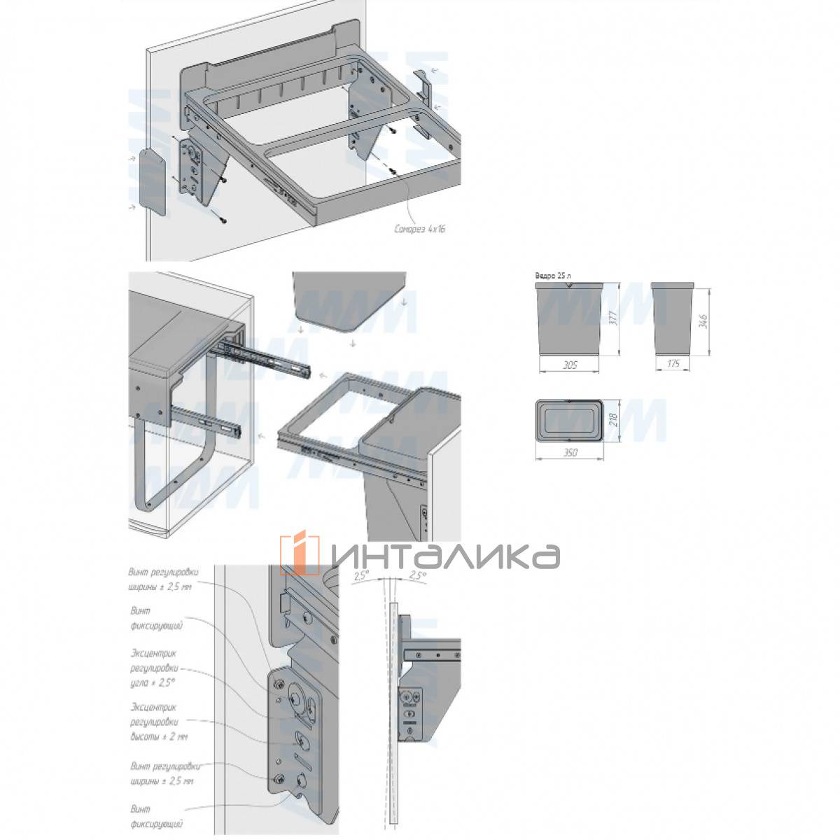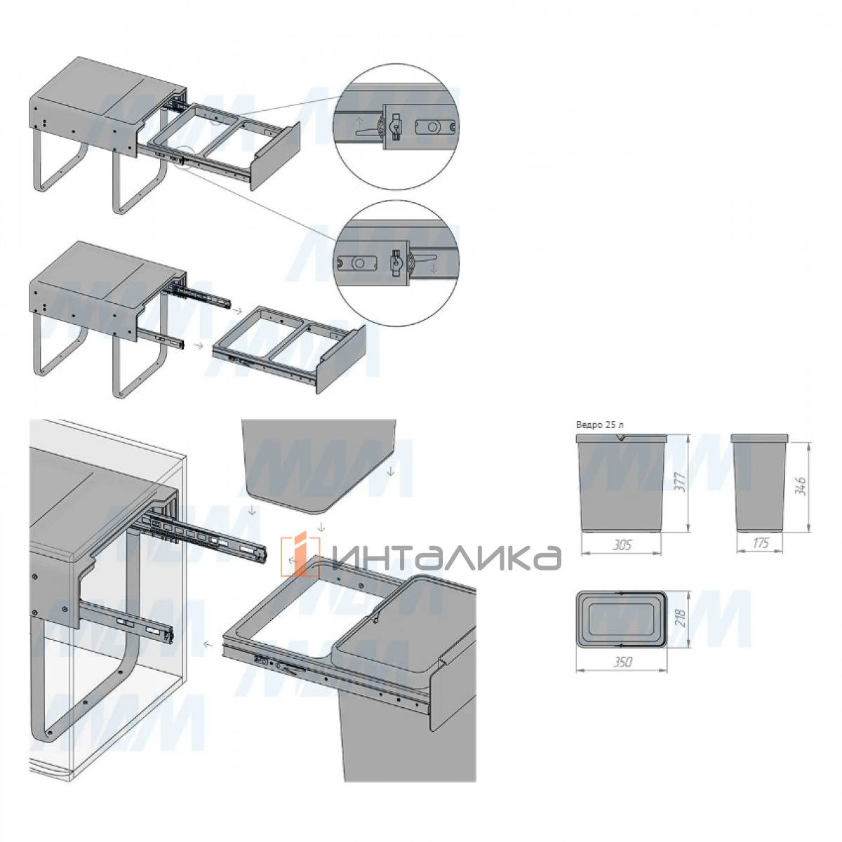 Комплектация: рама с выдвижной частью (в сборе) — 1 шт., ведро с ручкой (в сборе) — 2 шт., установочный крепёж для рамы — 1 компл.