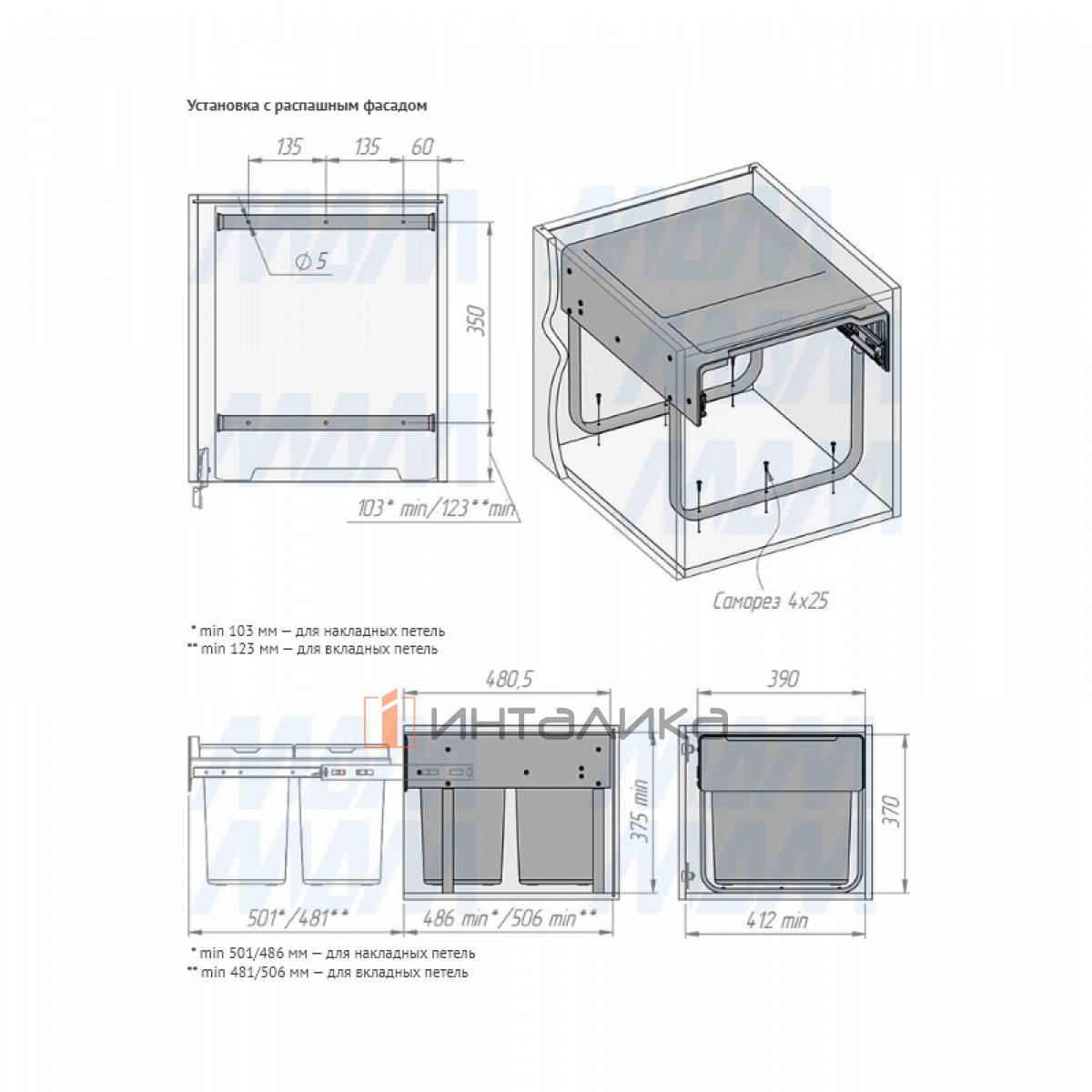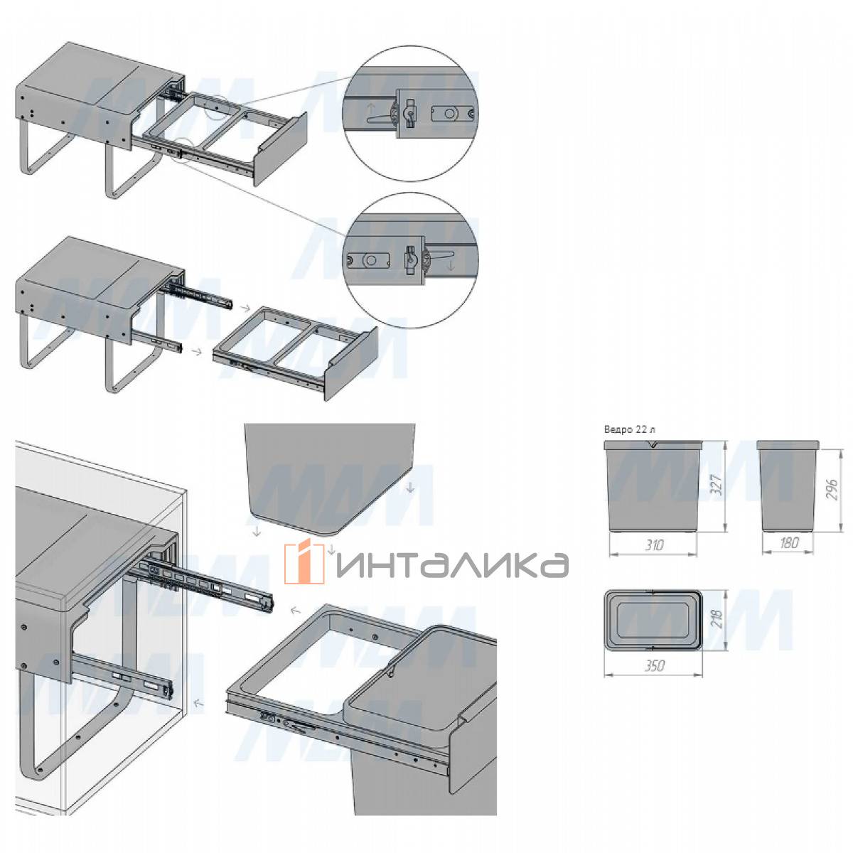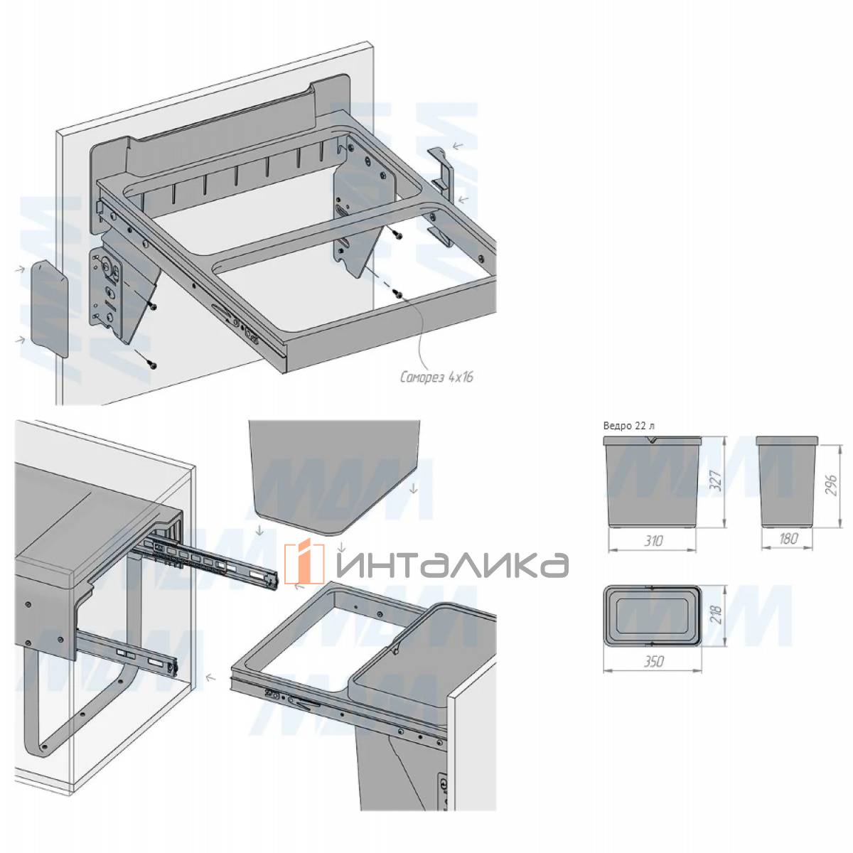 Комплектация: рама с выдвижной частью (в сборе) — 1 шт., ведро с ручкой (в сборе) — 2 шт., установочный крепёж для рамы — 1 компл.