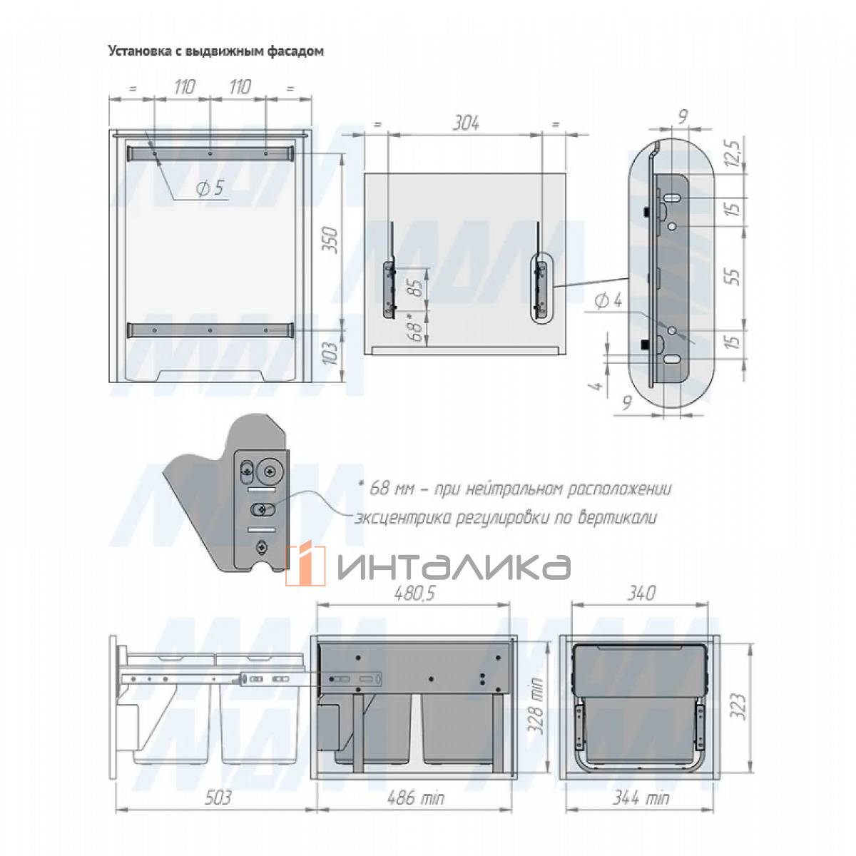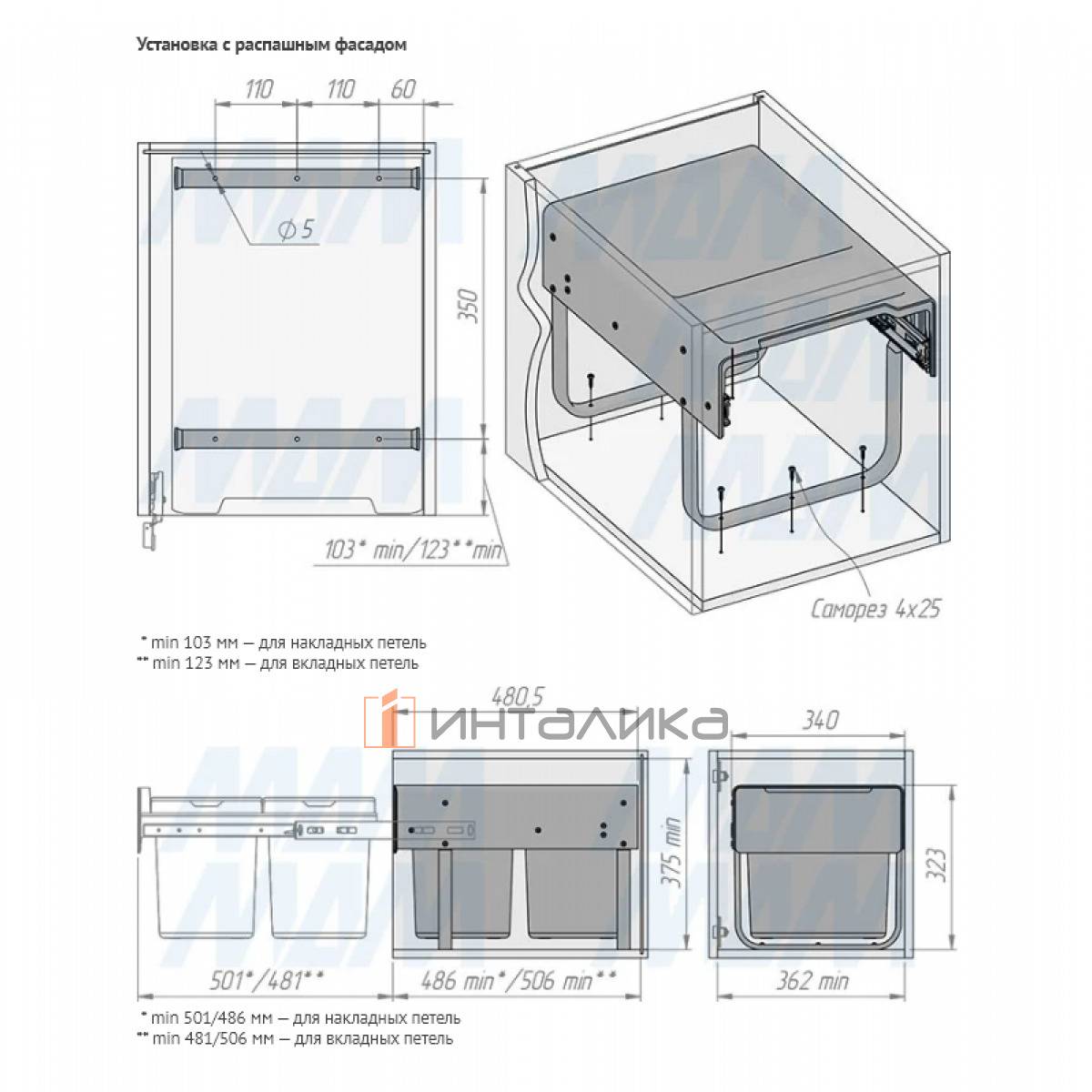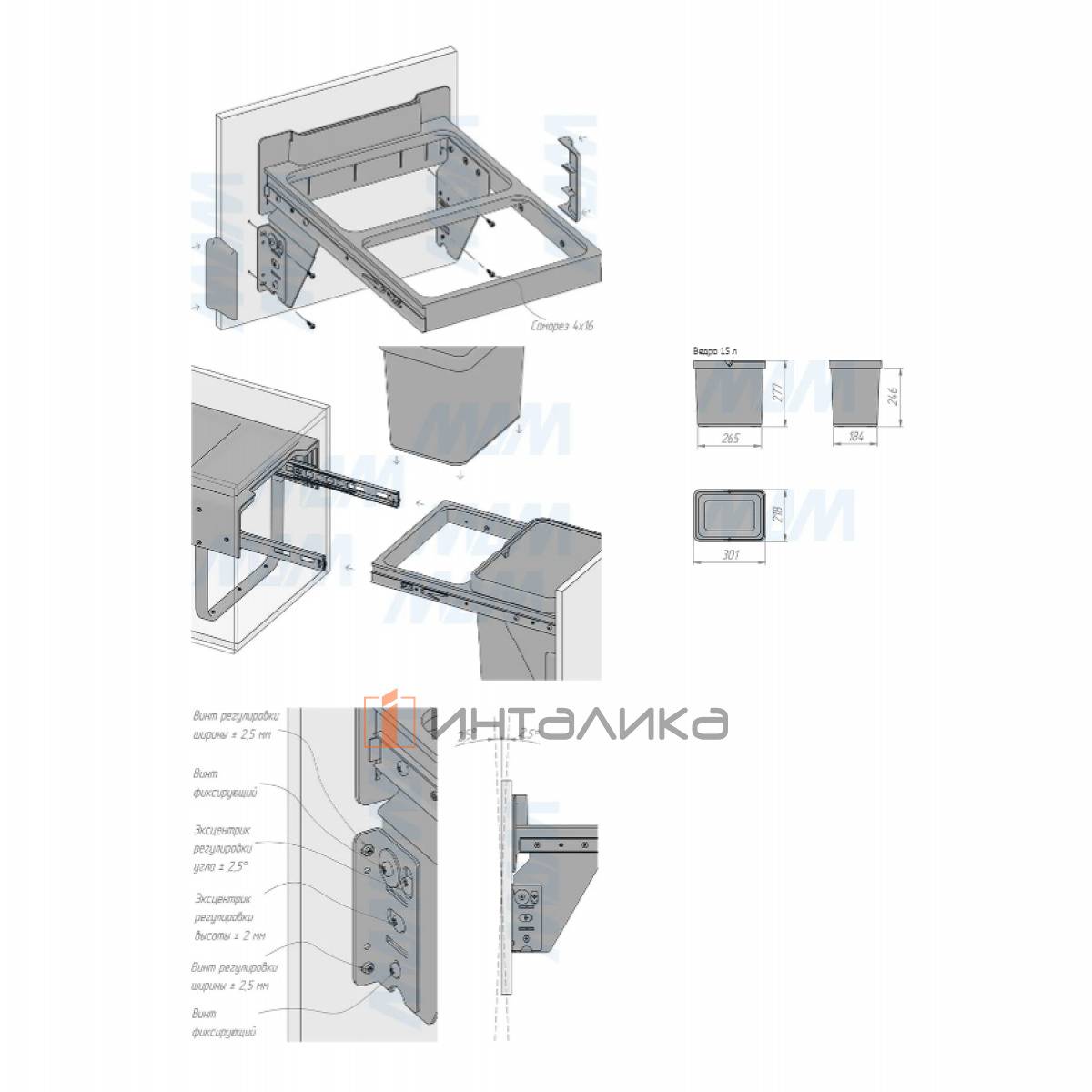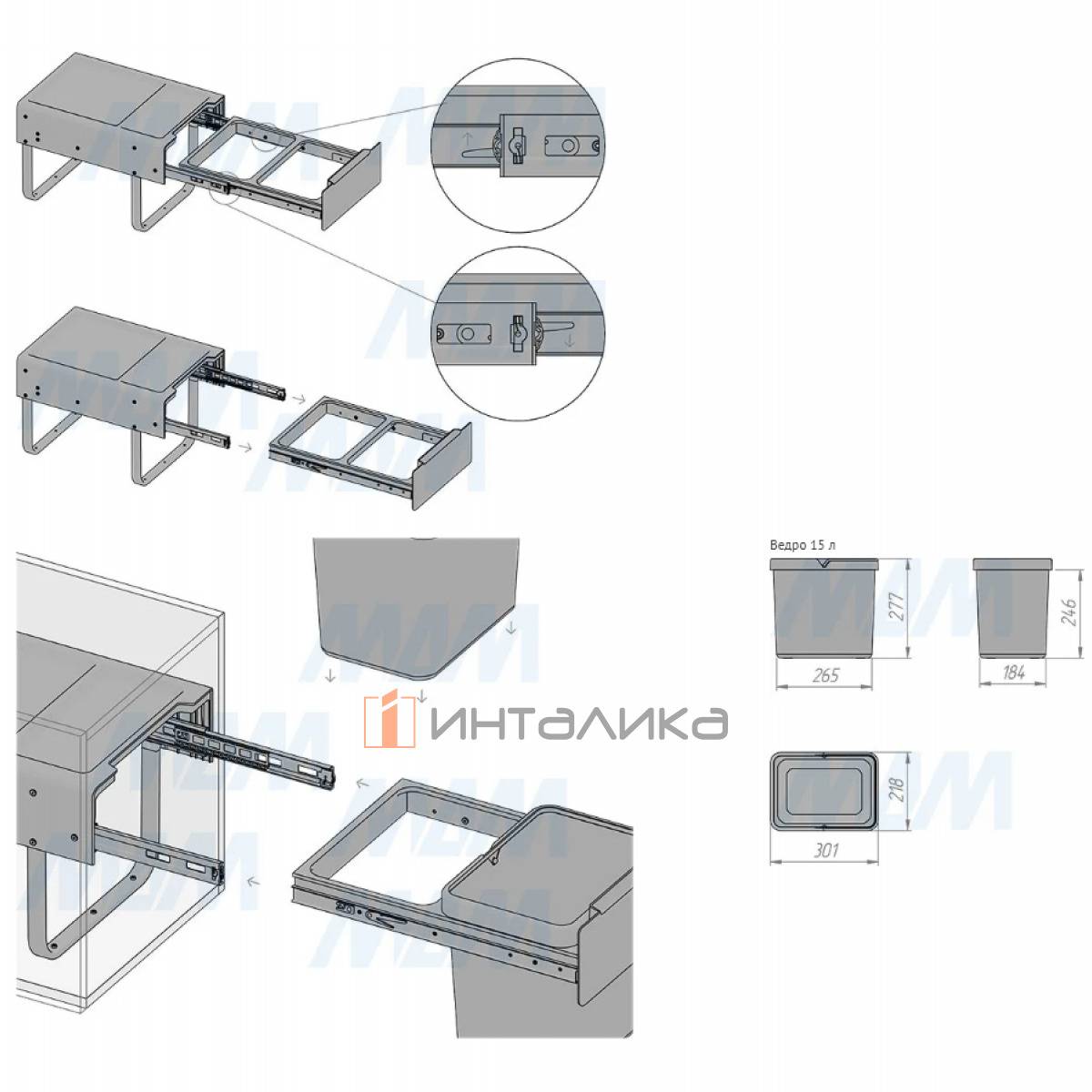Комплектация: рама с выдвижной частью (в сборе) — 1 шт., ведро с ручкой (в сборе) — 2 шт., установочный крепёж для рамы — 1 компл.