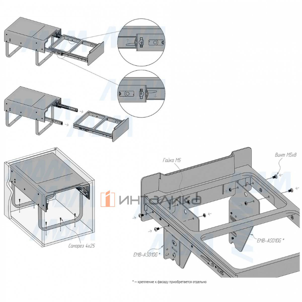 • любые типы фасадов: распашной / выдвижной (требуется дополнительно приобрести крепления фасада EMB-AS01DG);