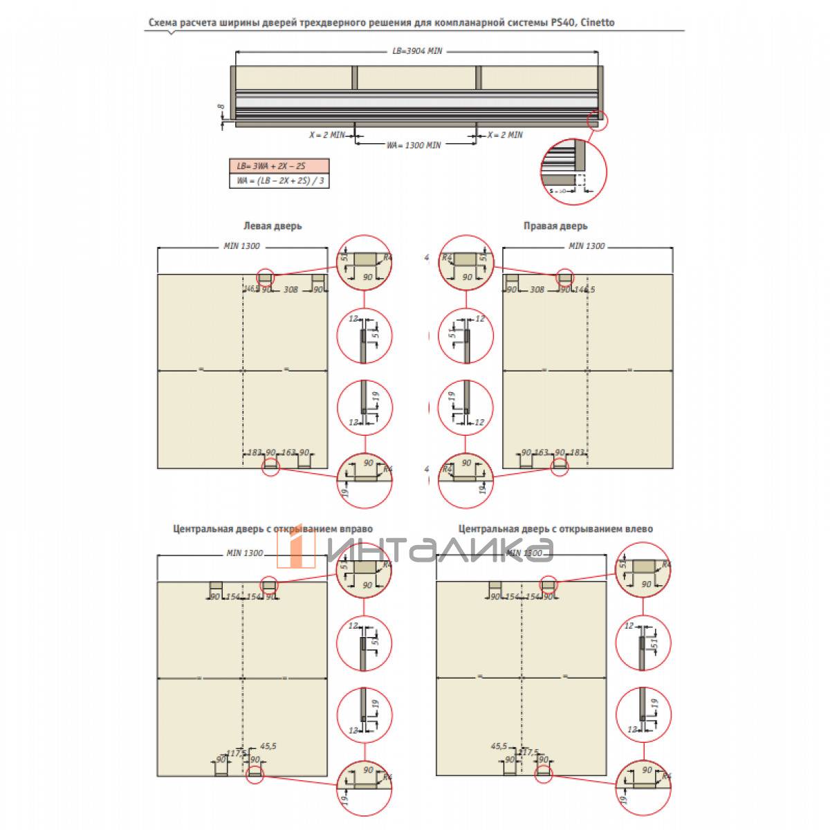 • максимальный вес фасада трехдверного решения: центральная дверь - 100 кг; боковые двери - 45 кг;