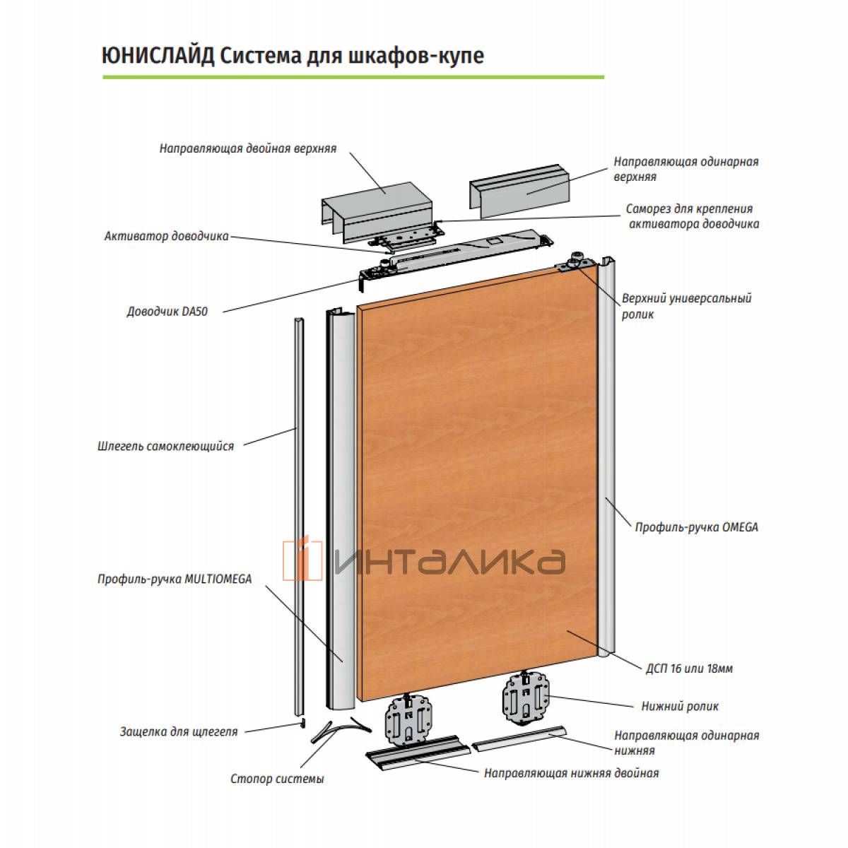 Система ЮНИСЛАЙД представляет собой комплексное решение для шкафов-купе с дверьми без алюминиевых профилей