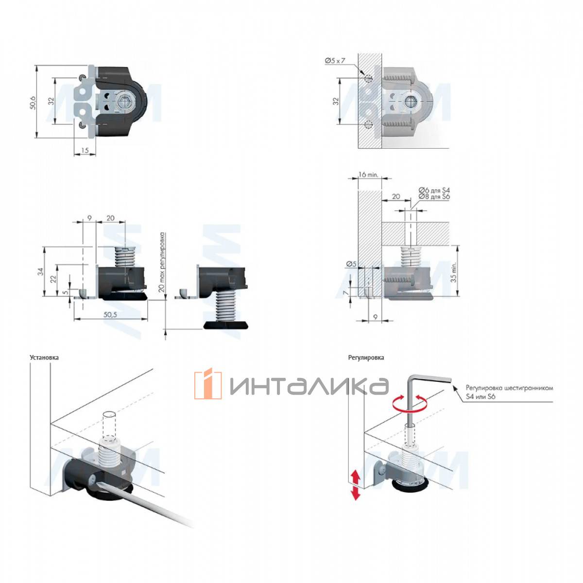 • регулировка осуществляется через отверстие ∅6 или 8 мм, просверленное насквозь в дне конструкции, шестигранными ключами 4 или 6 мм;