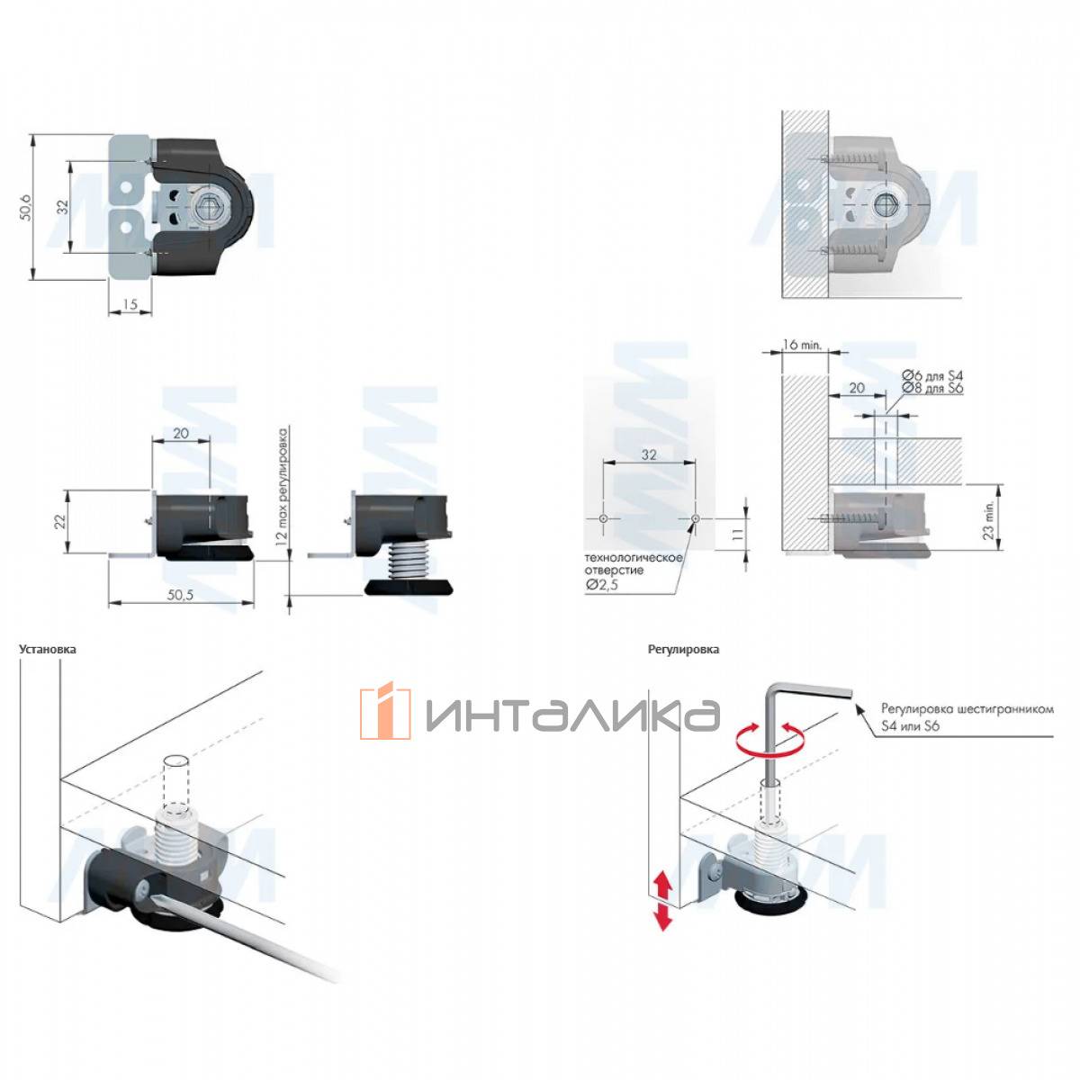 • регулировка осуществляется через отверстие ∅6 или 8 мм, просверленное насквозь в дне конструкции, шестигранными ключами 4 или 6 мм;