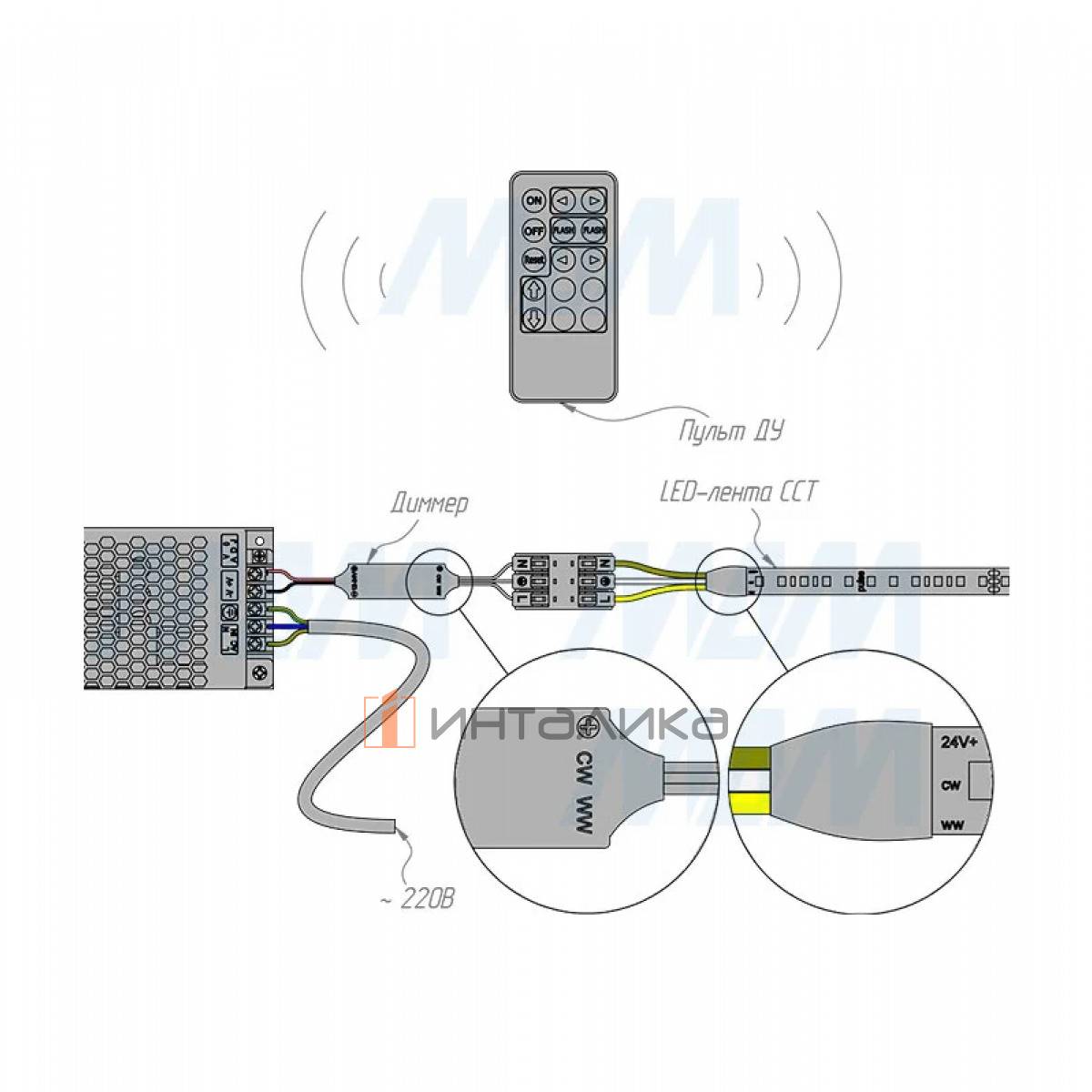 Миниатюрный диммер с радио-пультом ДУ для управления светодиодными лентами с изменяемой цветовой температурой (CCT).