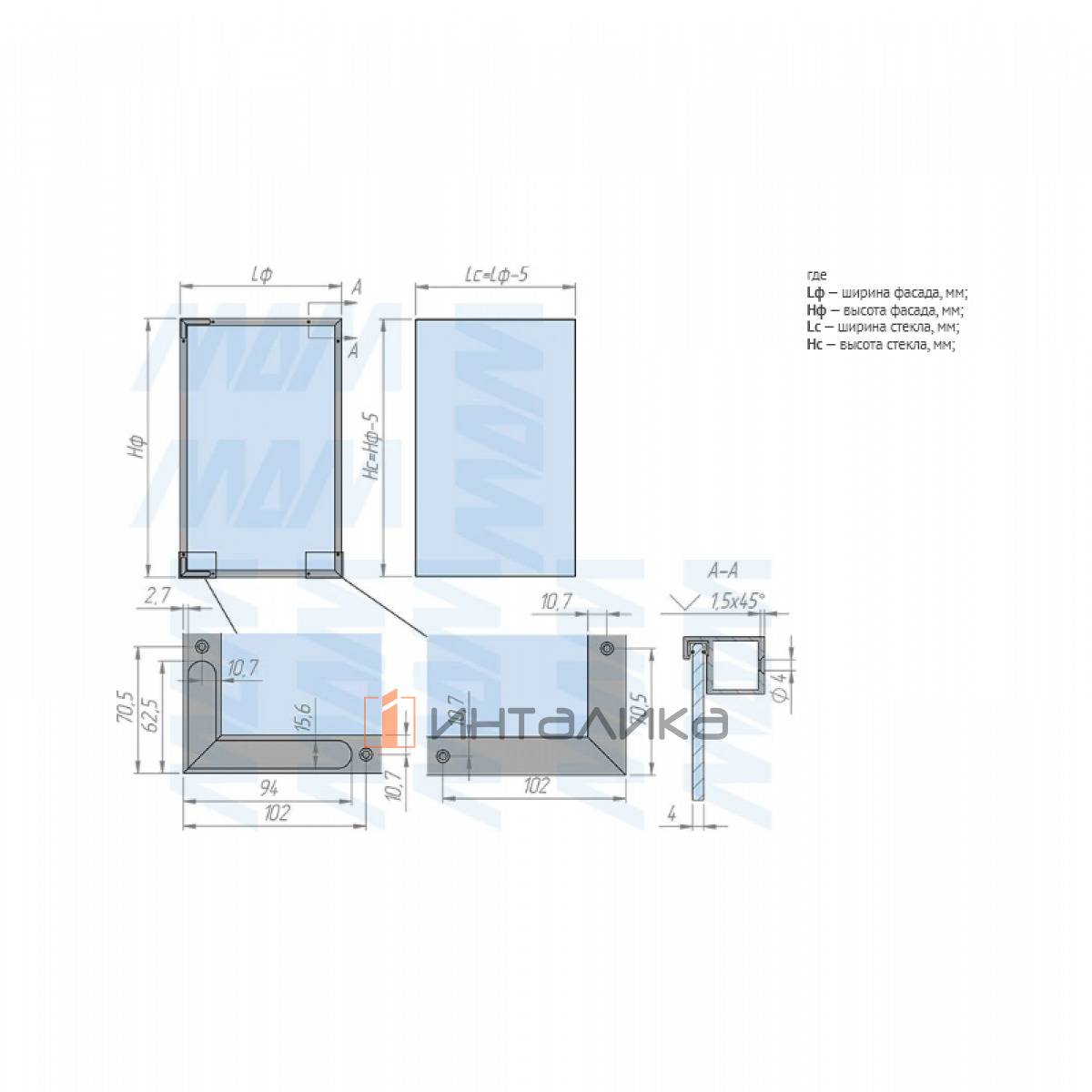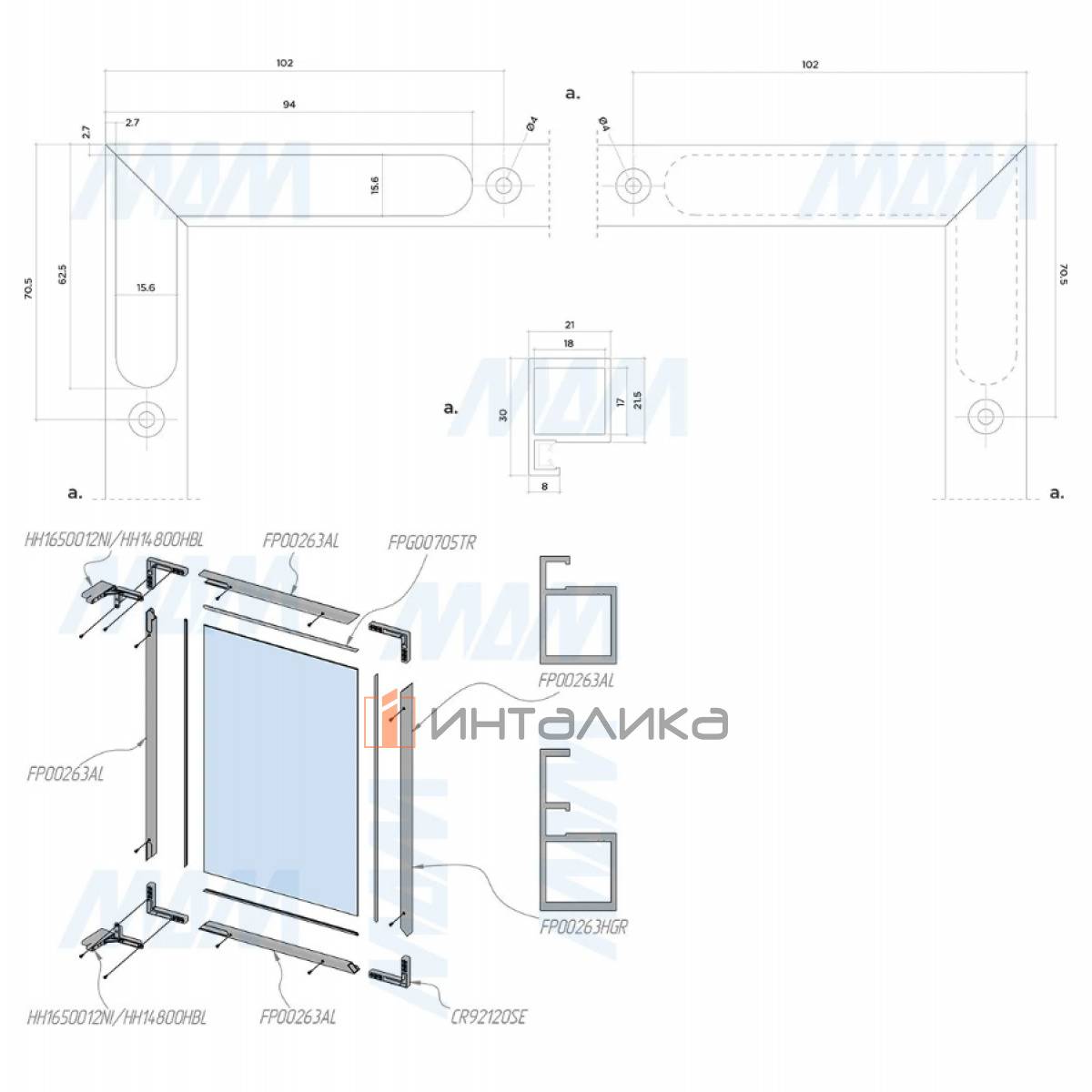 Комплектация: сборочный уголок - 4 шт., винт никель - 18 шт, винт чёрный - 18 шт.