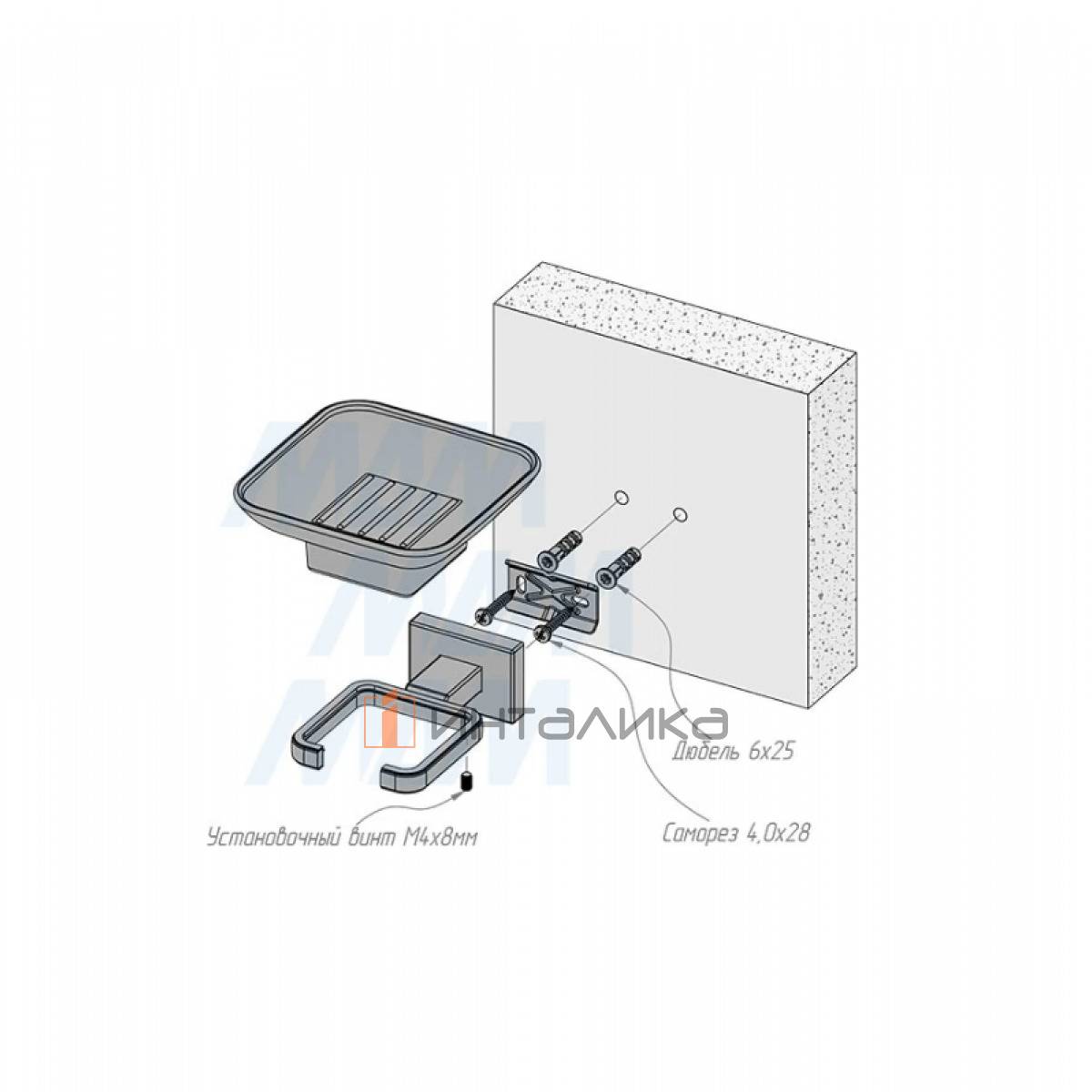 Комплектация: держатель настенный с мыльницей, установочная площадка и крепёж (саморез 4×28 мм - 2 шт., дюбель 6×25 мм - 2 шт., винт установочный М4×8 мм, шестигранник 2 мм)