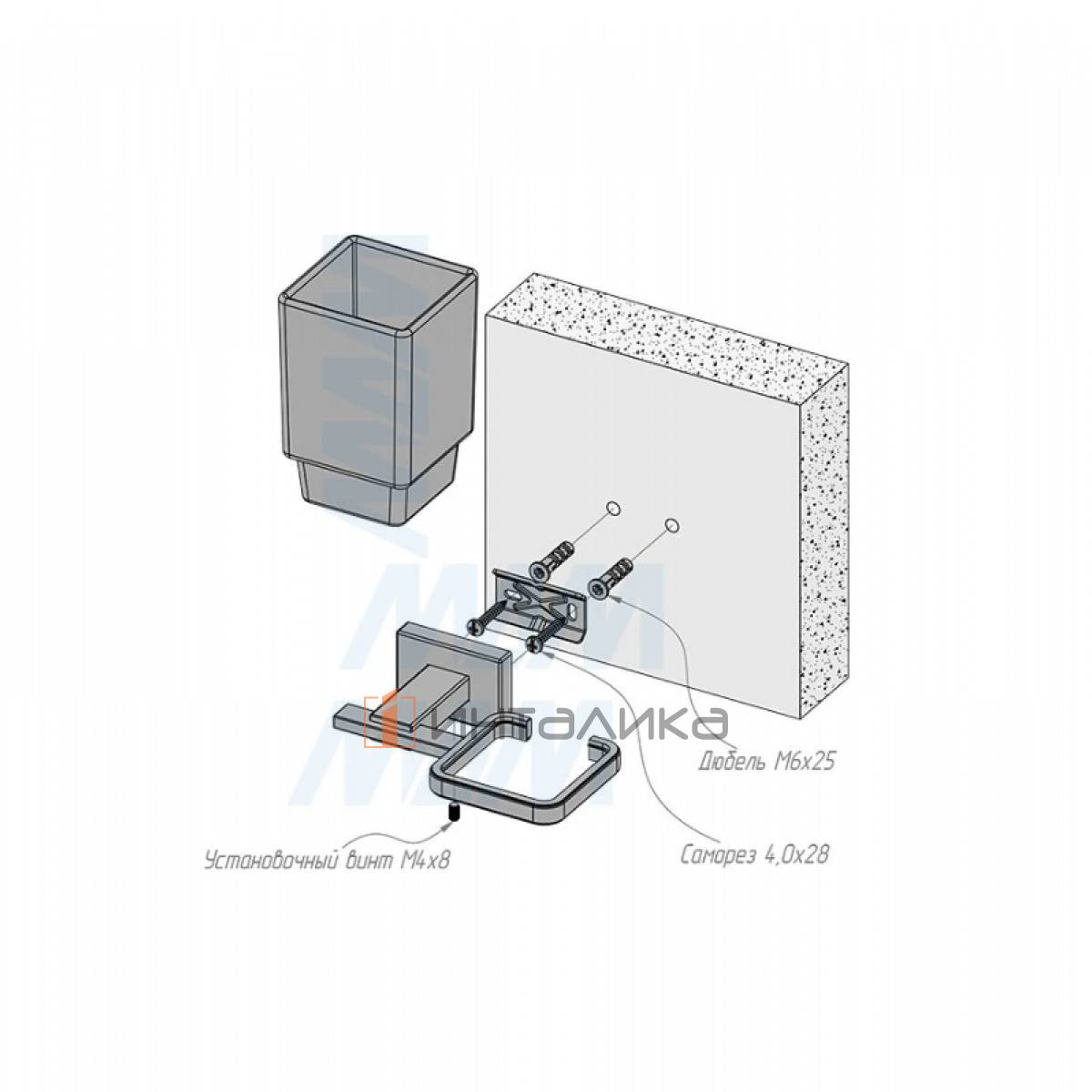 Комплектация: держатель настенный со стаканом, установочная площадка и крепёж (саморез 4×28 мм - 2 шт., дюбель 6×25 мм - 2 шт., винт установочный М4×8 мм, шестигранник 2 мм)