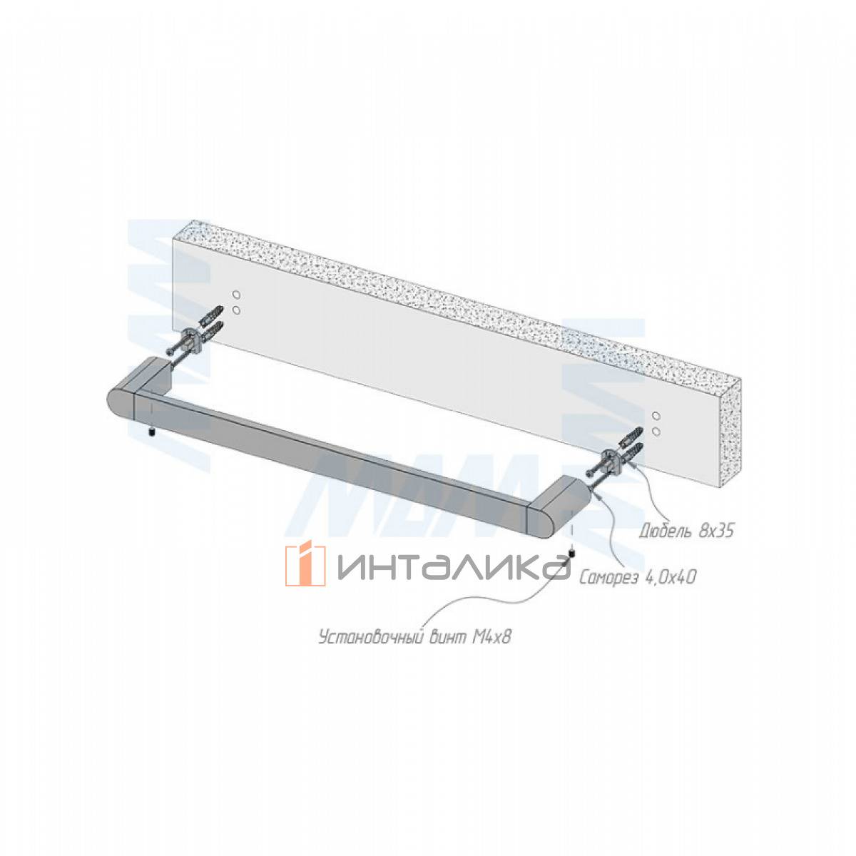 Комплектация: полотенцедержатель с установочными площадками и крепежом (саморез 4×40 мм - 4 шт., дюбель 8×35 мм - 4 шт., винт установочный М4×8 мм - 2 шт., шестигранник 2 мм)