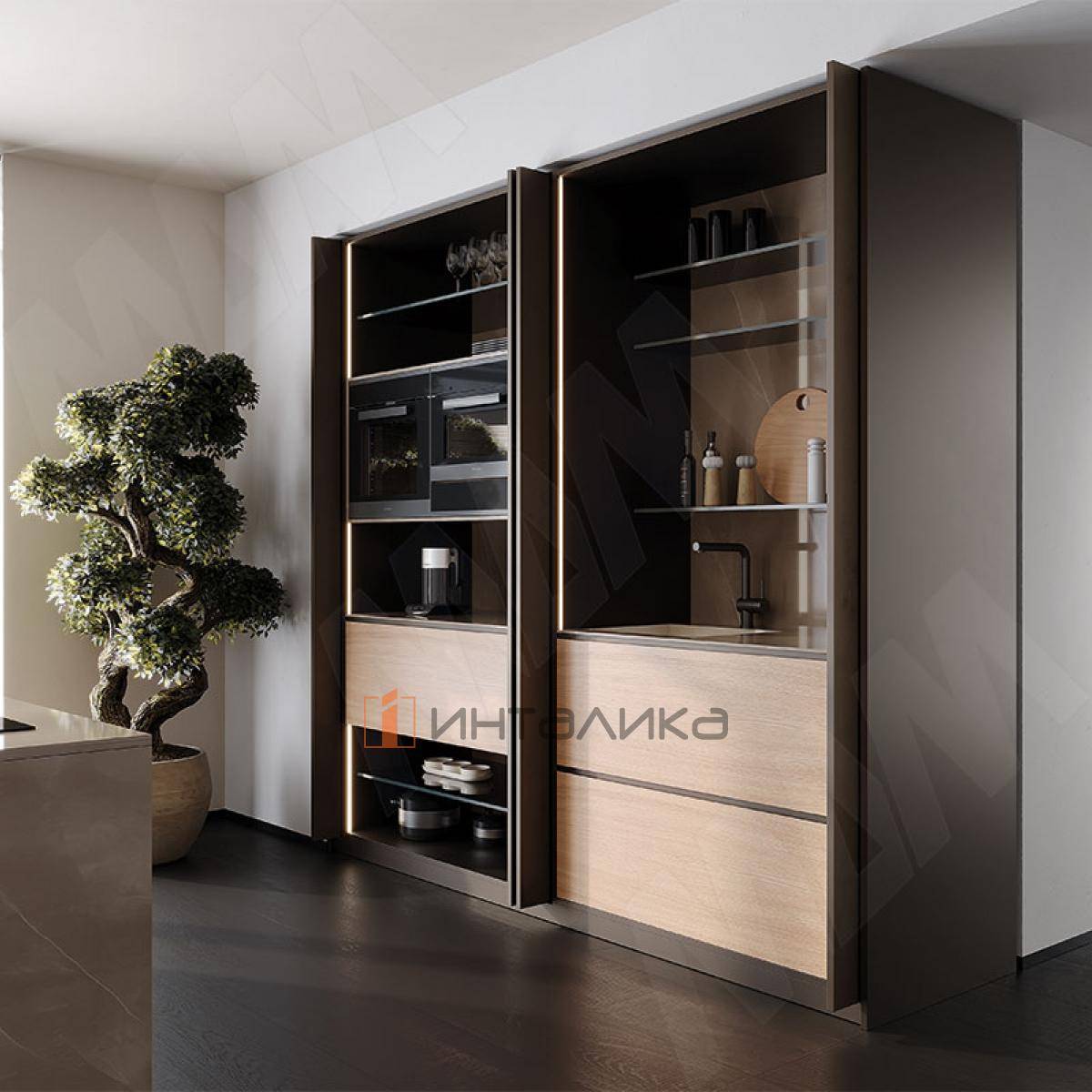 Особенностью системы является уникальный механизм, который позволяет фасаду открываться как классическая распашная дверь с помощью стандартных четырехшарнирных петель, а затем плавно задвигаться внутрь шкафа