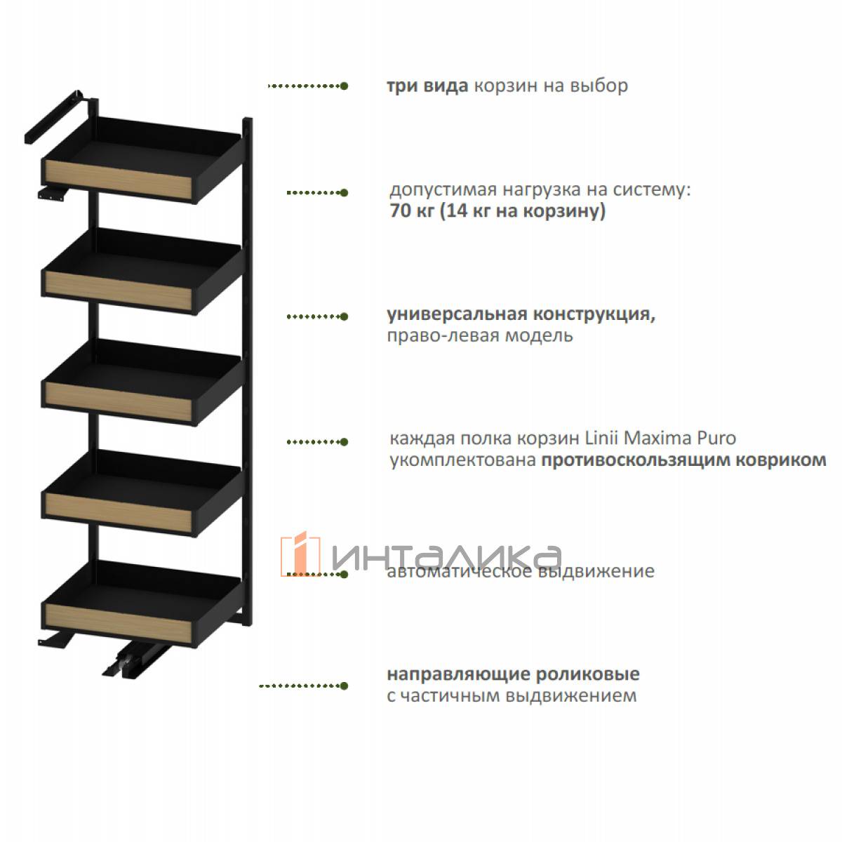 Допустимая нагрузка на систему - 70 кг, на одну корзину - 14 кг