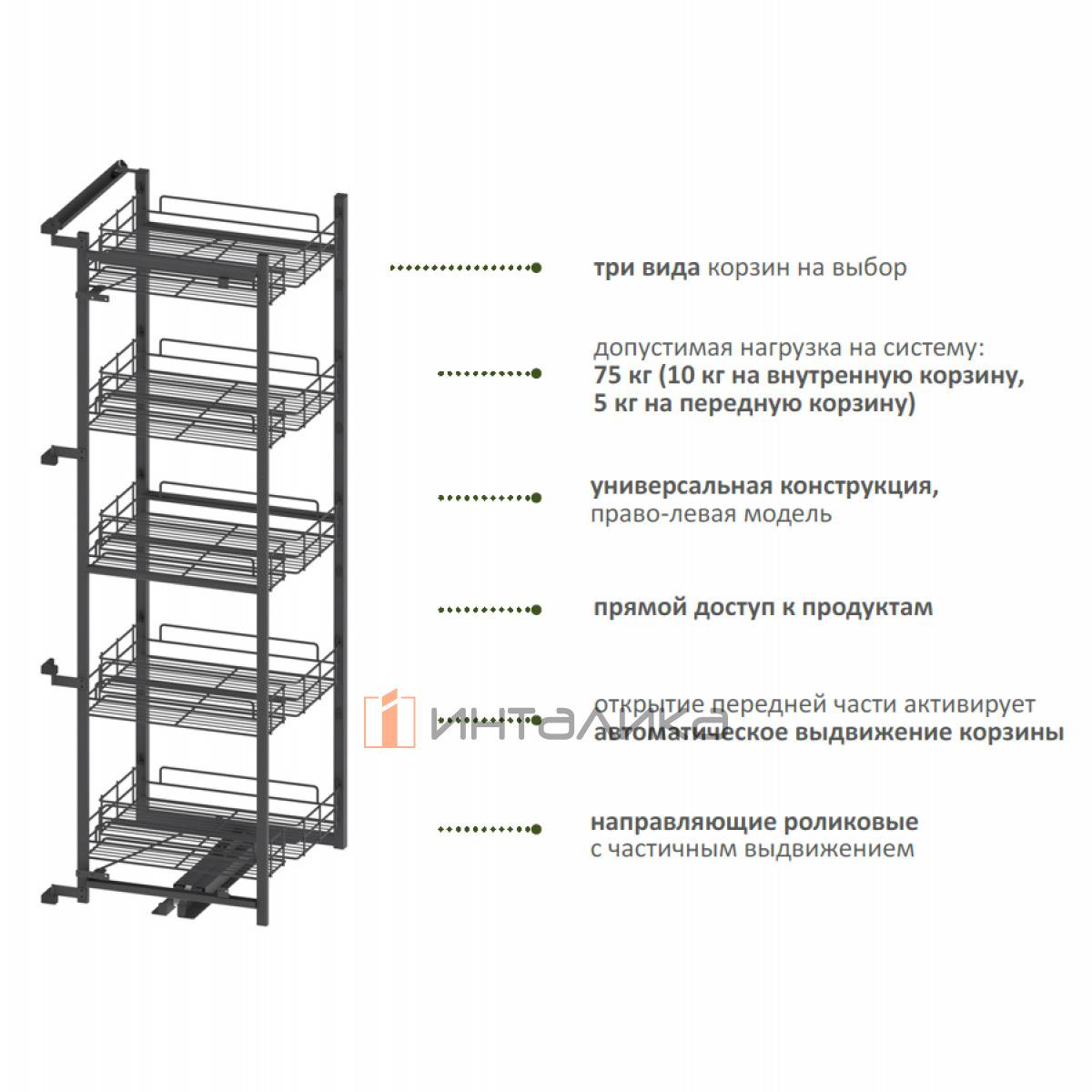 Допустимая нагрузка на систему - 75 кг (10 кг на внутреннюю, 5 кг на переднюю корзину)