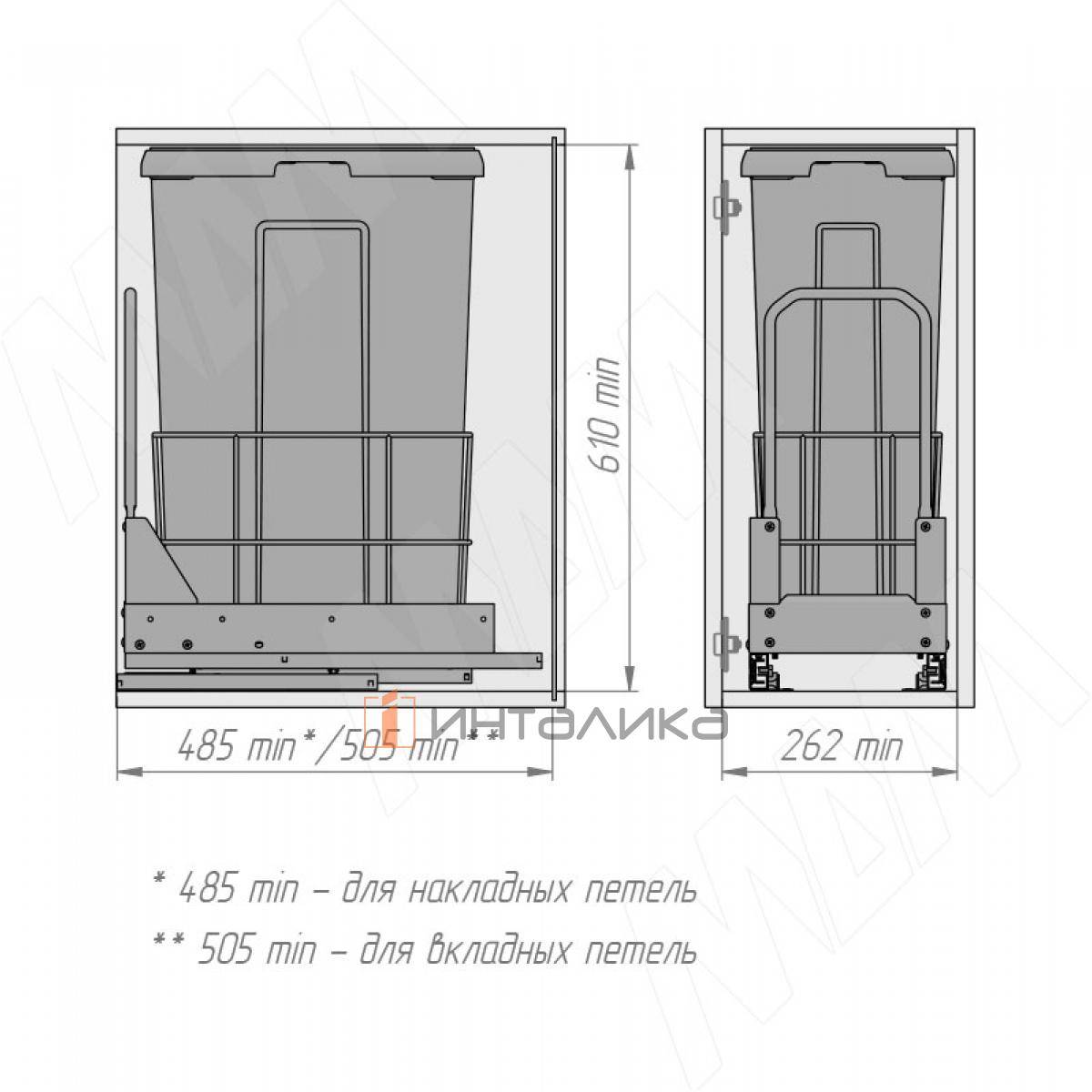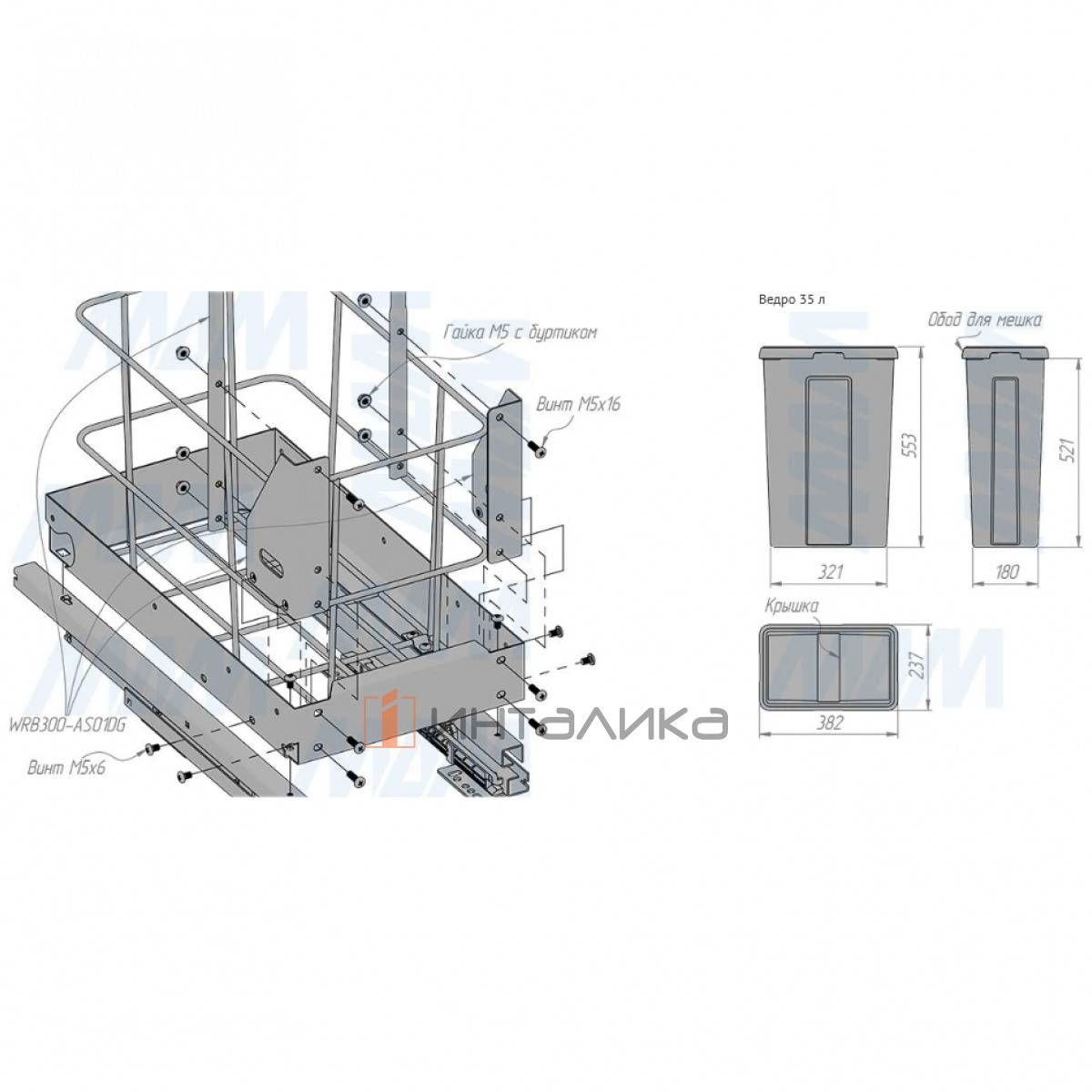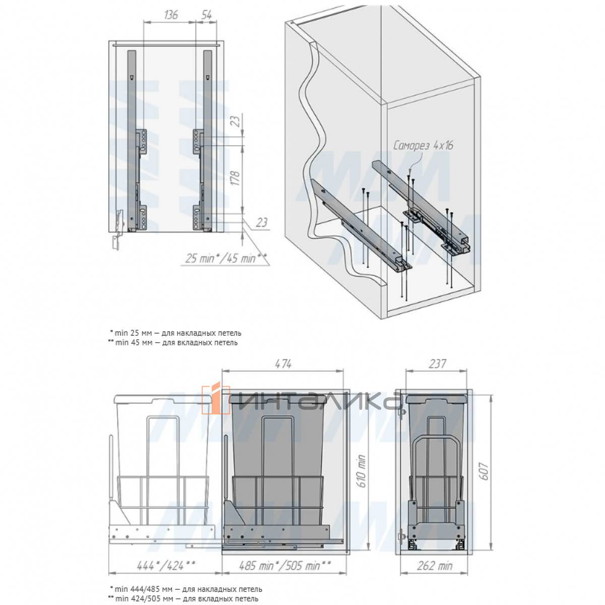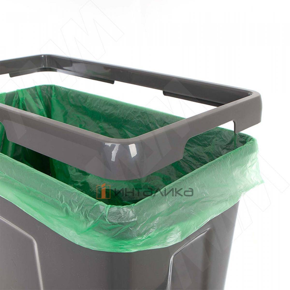 Комплектация: комплект рамы (платформы) - 1 шт., ведро с рамкой для пакета, ручками и индивидуальной крышкой - 1 компл., ручка для выдвижения - 1 компл., направляющие - 1 компл.