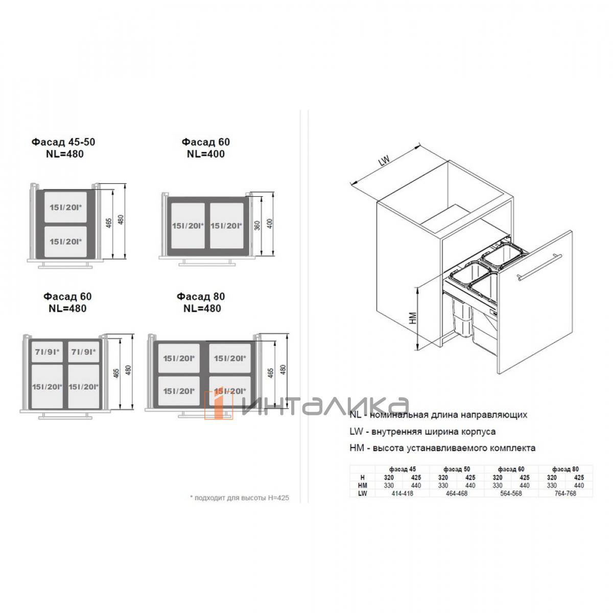 Выдвижная система мусорных ведер Rejs Segrego в корпус 600, H425, NL480, ведра 2х9 л и 2х20 л, серый, WE28.4039.01.549