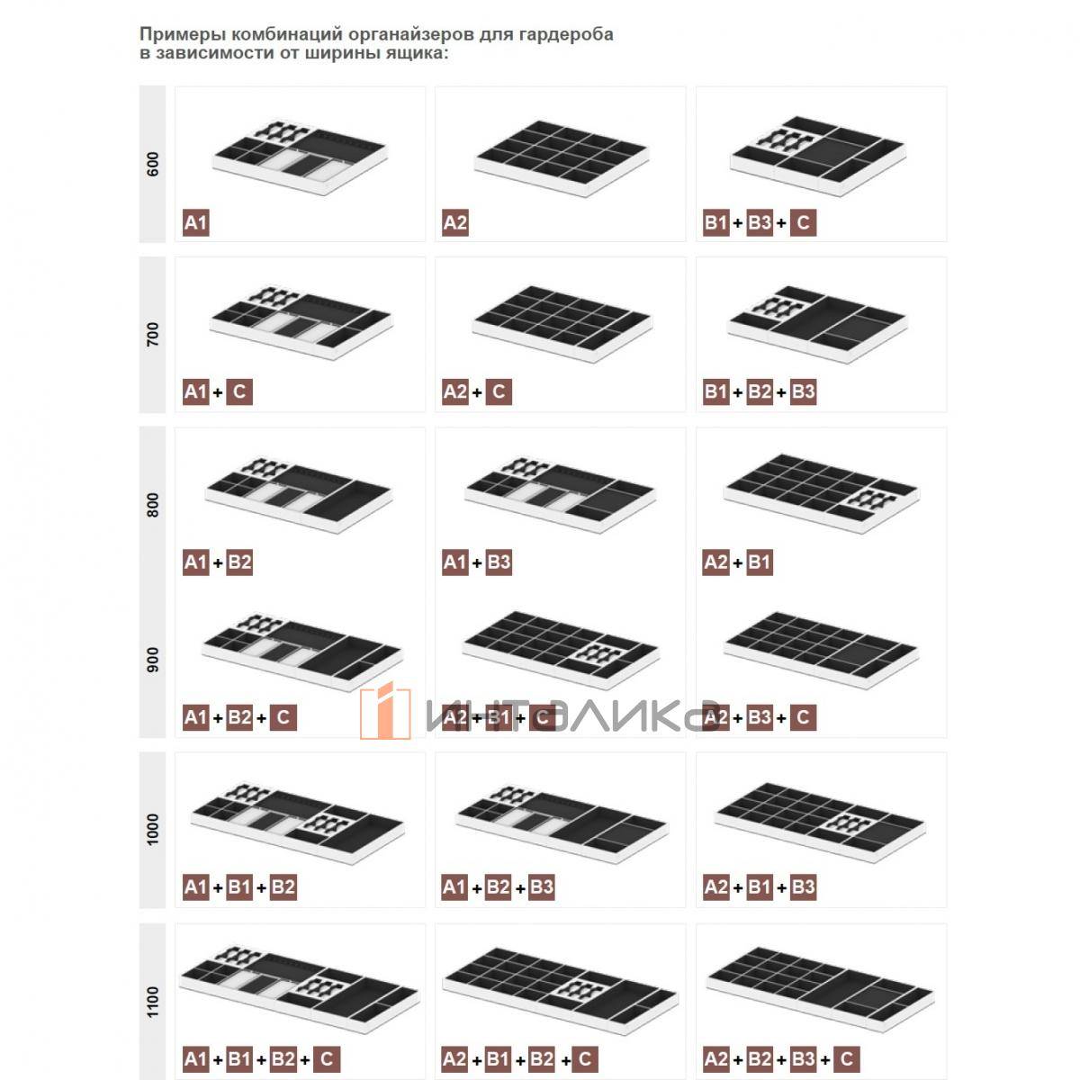 Органайзеры устанавливаются в ящики с фасадом, для внутренних ящиков не предусмотрены