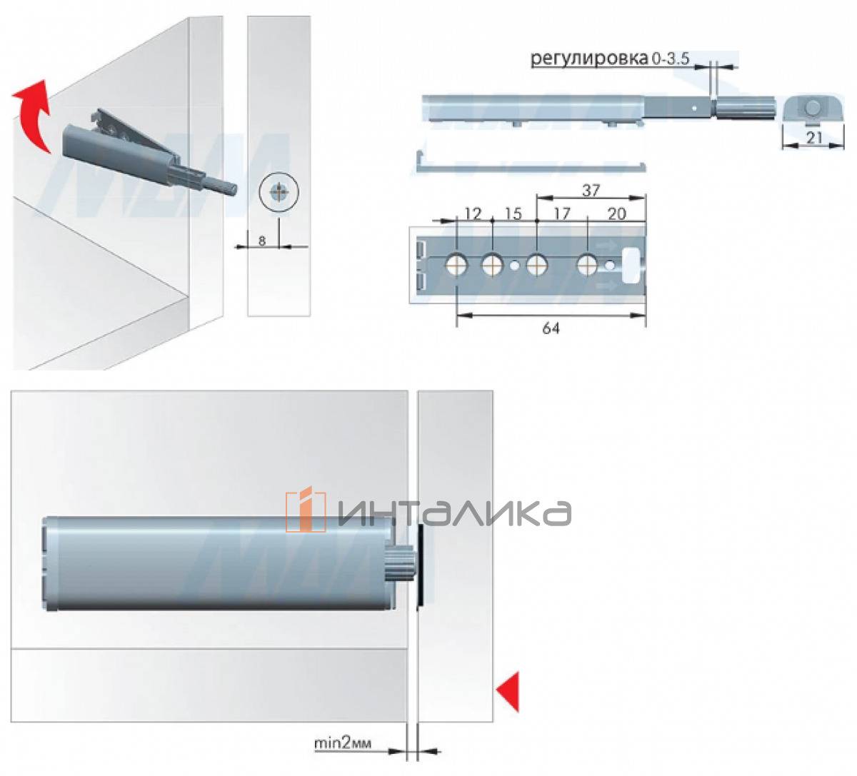 Комплект металлический толкатель Push-to-Open 40 мм накладной с магнитом, линейным крепежом и ответными планками, BS-020800