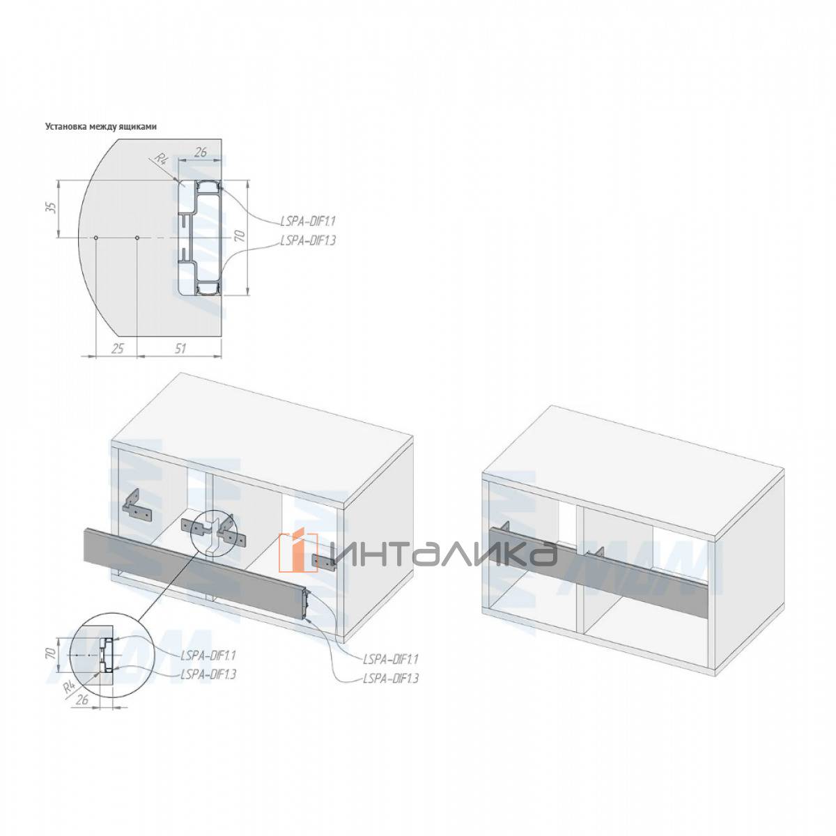 • горизонтальная установка для верхнего ящика нижнего яруса, горизонтальная установка для среднего ящика нижнего яруса, вертикальная установка для колонн;
