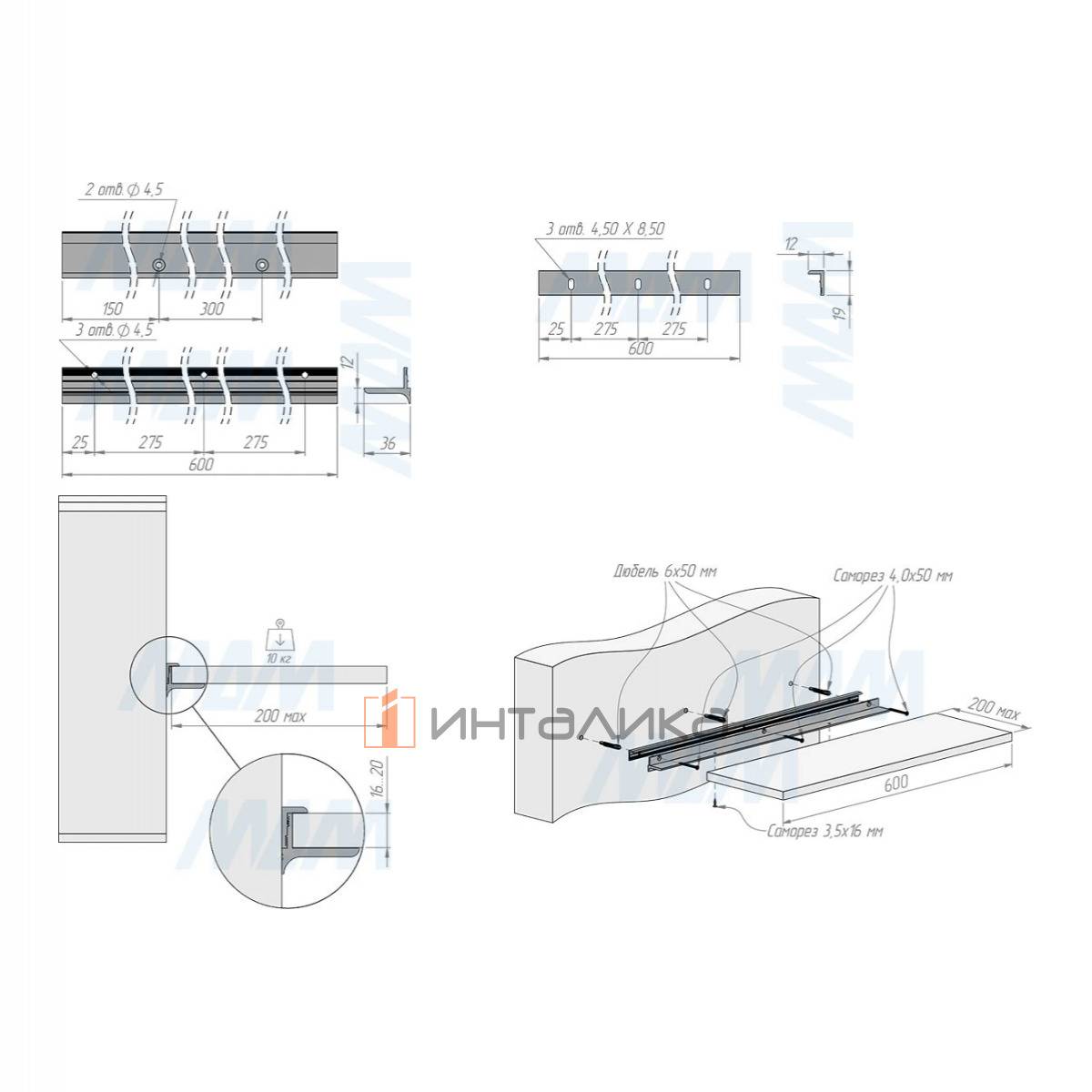 Комплектация: менсолодержатель, стоящий из двух частей, крепеж; дюбель 6×50 мм - 3 шт.; саморез 4×50 мм - 3 шт.; саморез 3,5×16 мм - 2 шт.