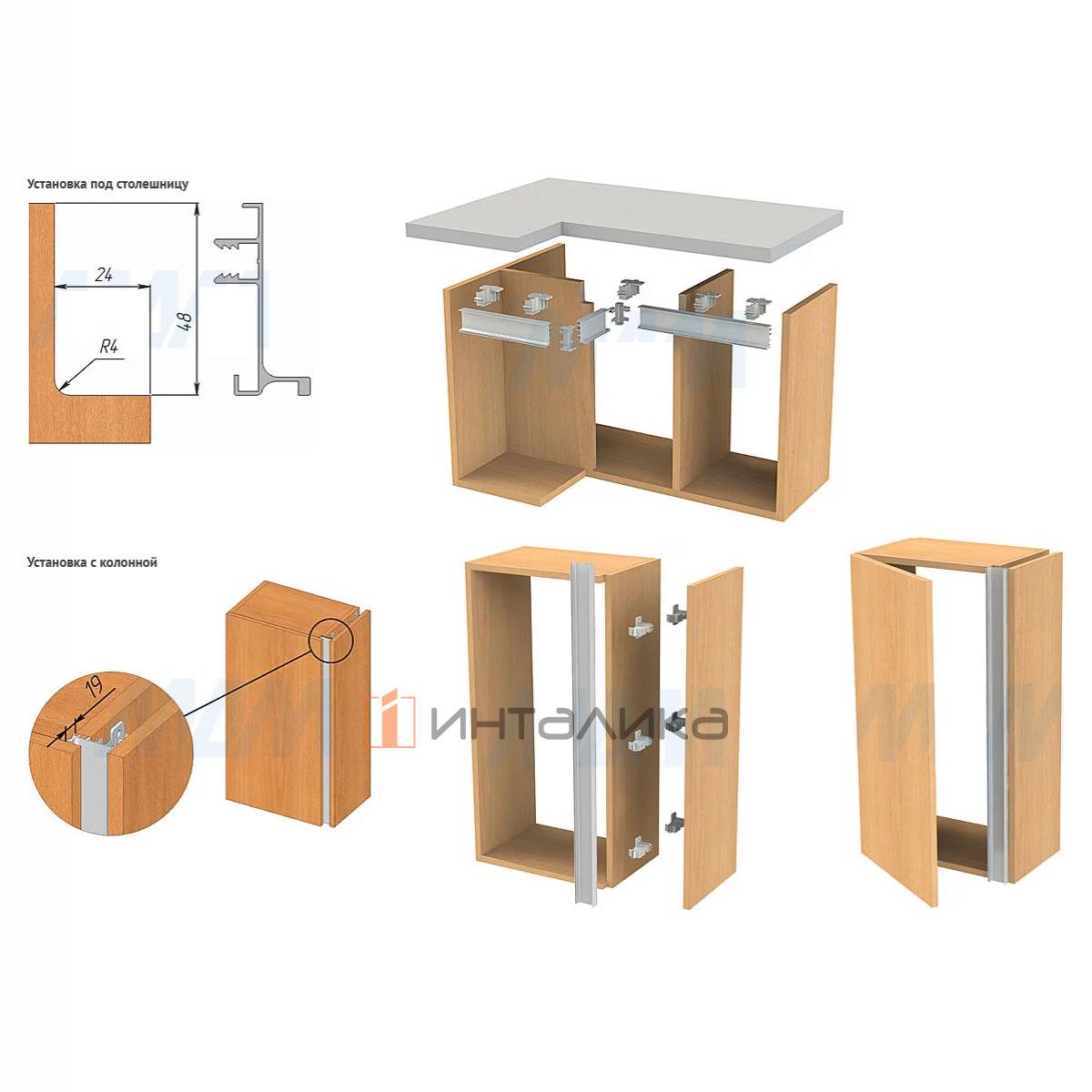 Примечание: горизонтальная установка под столешницу в корпусах нижнего яруса и вертикальная установка для колонн (используется с плитами 18 мм, для установки с плитой 16 мм используется проставка GL.6272.0000.00)