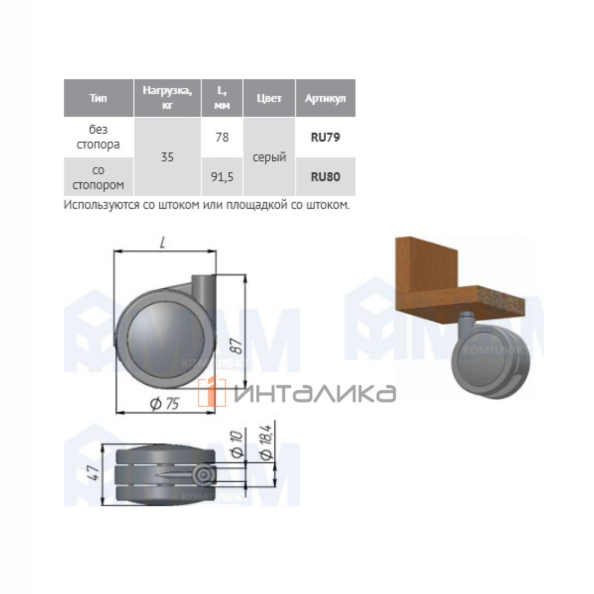 Опора двухколесная усиленная 75 мм (без стопора), RU79
