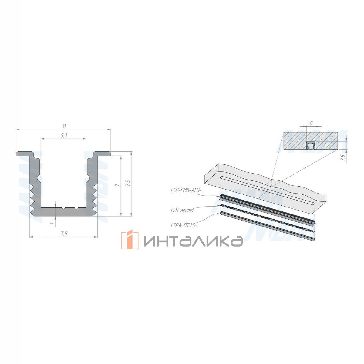 Профиль FM8, врезной узкий, для ленты с основанием 5мм, белый матовый, 11х7,5мм, L-2000, LSP-FM8-ALU-2000-WHM