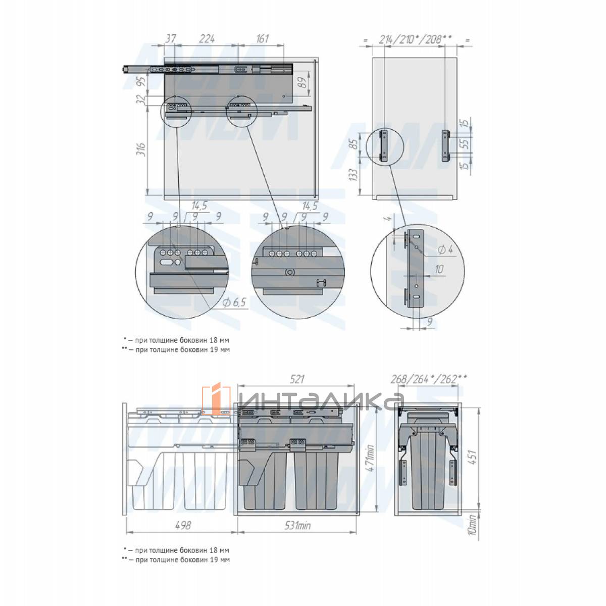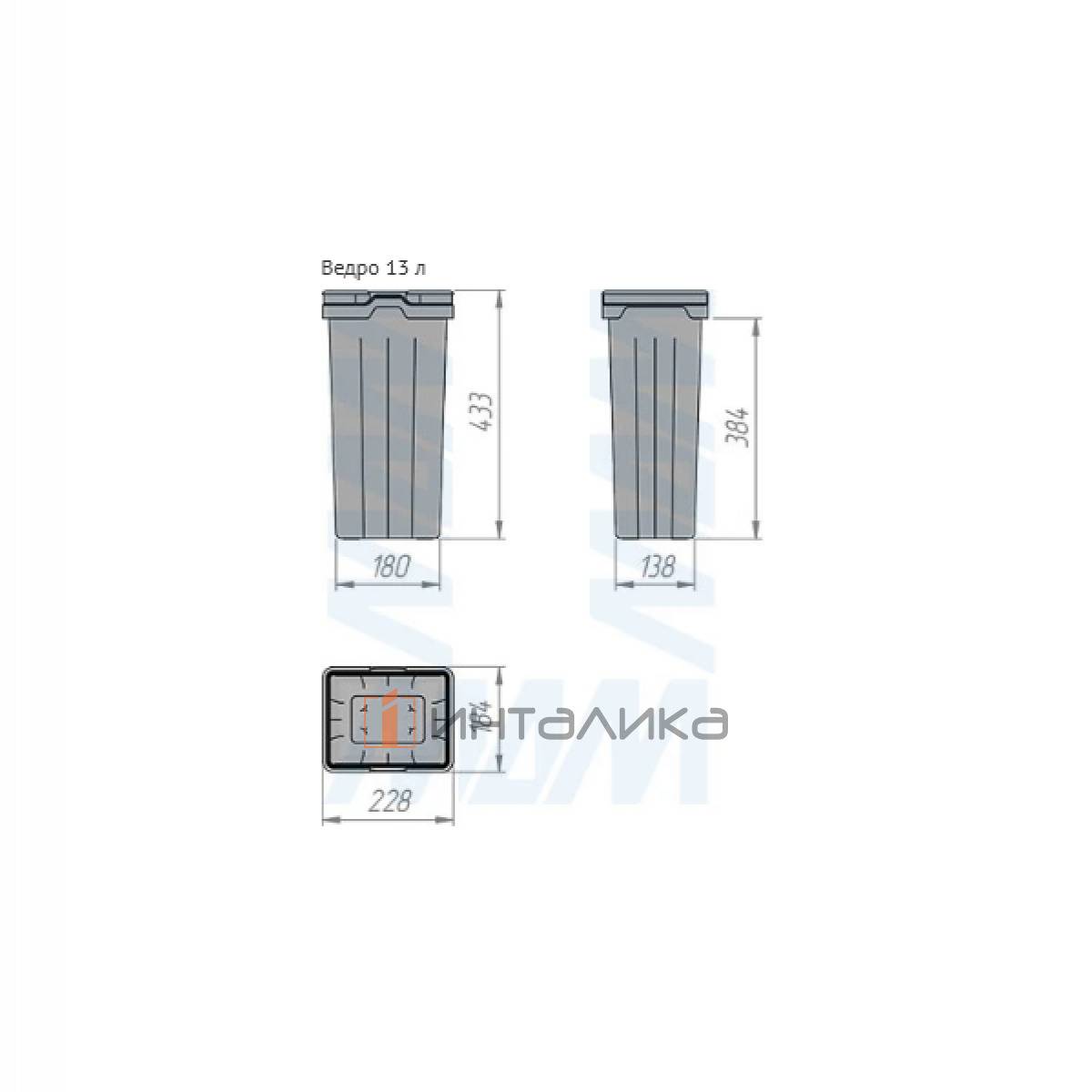 Комплектация: рама - 1 шт., боковины рамы - 2 шт., направляющие рамы - 1 компл., крепление фасада - 2 шт., ведро с ручками - 2 компл., заглушки креплений фасада - 2 шт., полка выдвижная - 1 шт., направляющие полки с кронштейнами - 2 шт., боковины полки - 2 шт., противоскользящее покрытие - 1 шт., крепёж - 1 компл.