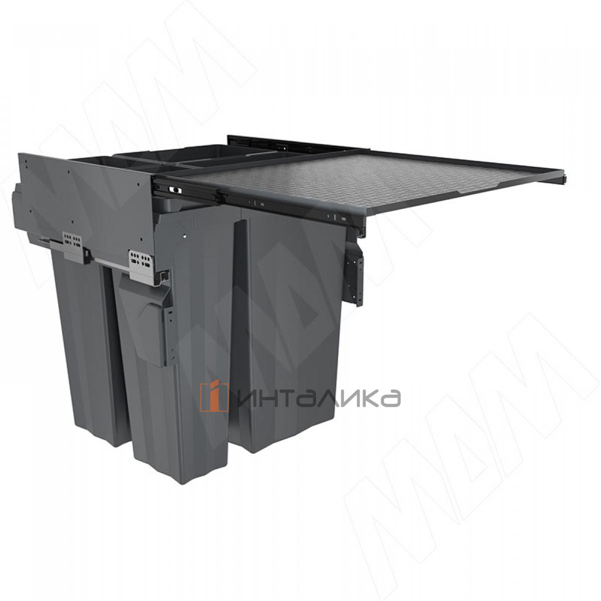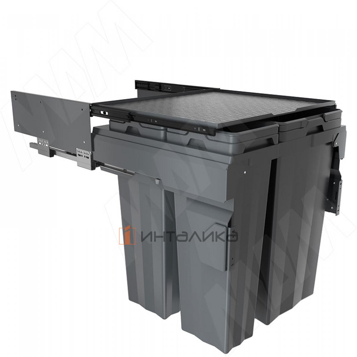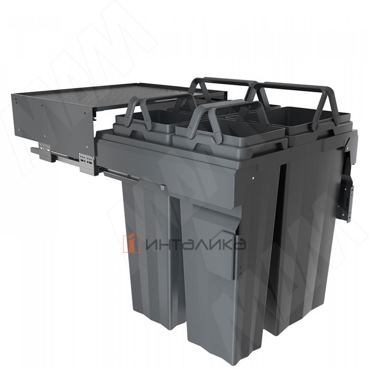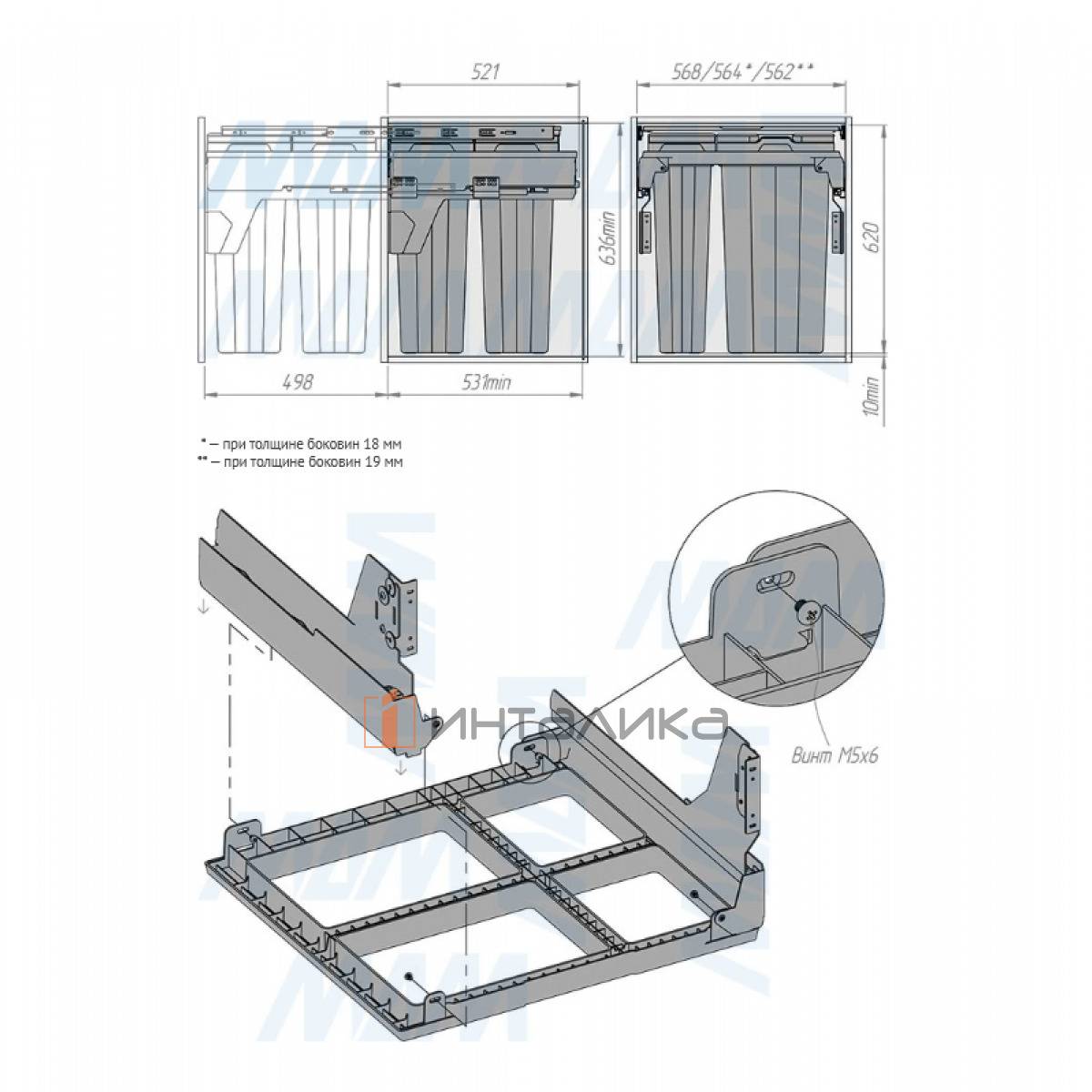 Комплектация: рама - 1 шт., боковины рамы - 2 шт., направляющие рамы - 1 компл., крепление фасада - 2 шт., ведро с ручками - 4 компл., заглушки креплений фасада - 2 шт., полка выдвижная - 1 шт., направляющие полки с кронштейнами - 2 шт., боковины полки - 2 шт., противоскользящее покрытие - 1 шт., крепёж - 1 компл.