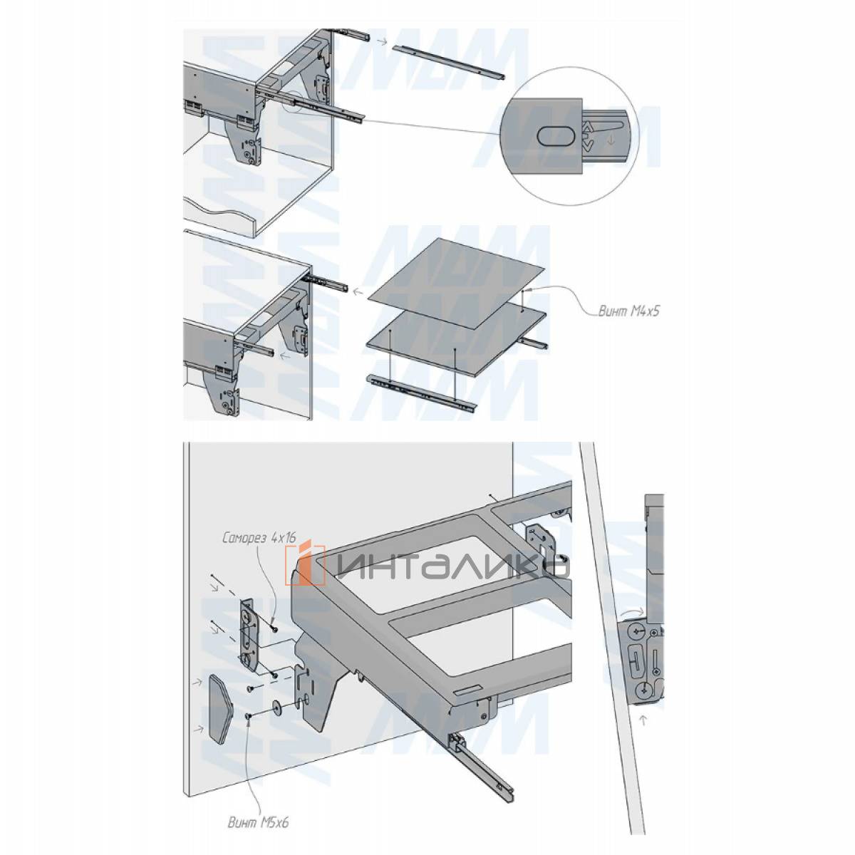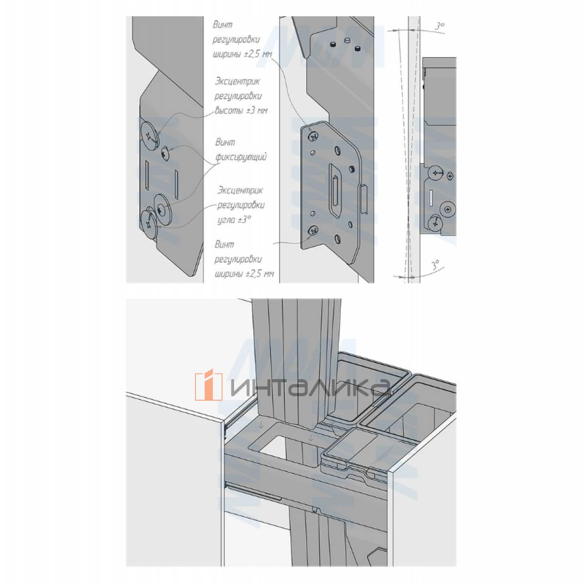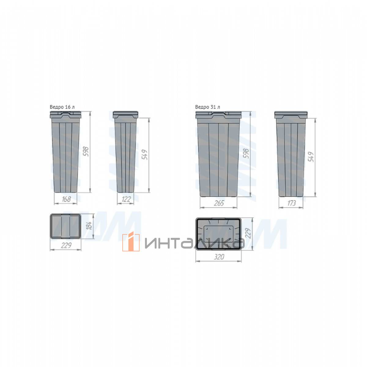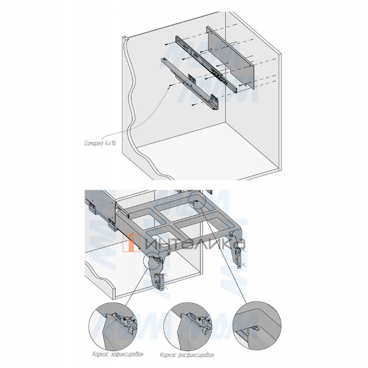 Комплектация: рама - 1 шт., боковины рамы - 2 шт., направляющие рамы - 1 компл., крепление фасада - 2 шт., ведро с ручками - 4 компл., заглушки креплений фасада - 2 шт., полка выдвижная - 1 шт., направляющие полки с кронштейнами - 2 шт., боковины полки - 2 шт., противоскользящее покрытие - 1 шт., крепёж - 1 компл.