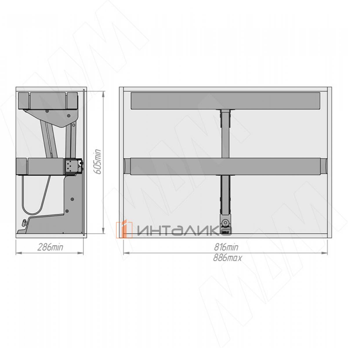 Внимание! Механизм имеет большой вес! Необходимо обязательно рассчитать максимальный вес корпуса с механизмом, фасадами, фурнитурой и полезной нагрузкой для правильного выбора навесов