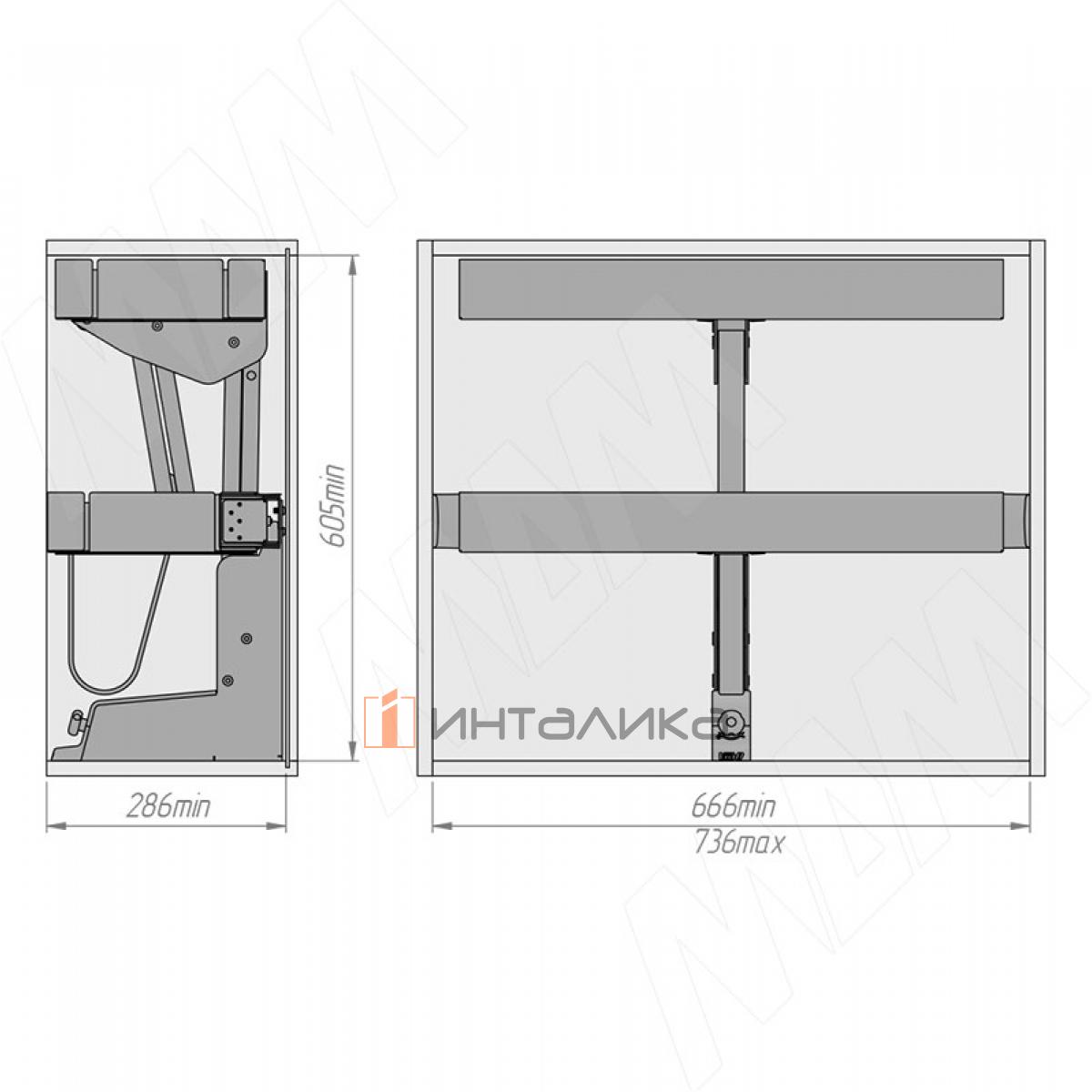 Внимание! Механизм имеет большой вес! Необходимо обязательно рассчитать максимальный вес корпуса с механизмом, фасадами, фурнитурой и полезной нагрузкой для правильного выбора навесов