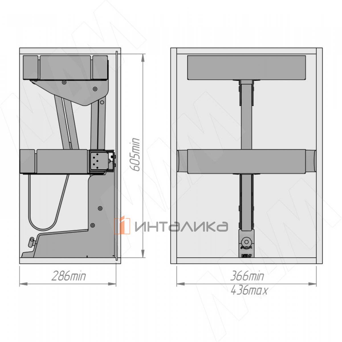 Внимание! Механизм имеет большой вес! Необходимо обязательно рассчитать максимальный вес корпуса с механизмом, фасадами, фурнитурой и полезной нагрузкой для правильного выбора навесов