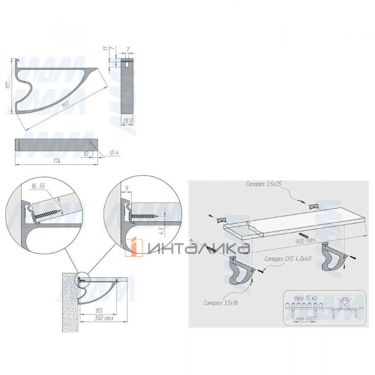 Комплектация: менсолодержатель - 1 шт., фиксирующая планка - 1 шт., крепёж для полки: саморез 3,5×25 мм - 1 шт., саморез 3,5×16 мм - 1 шт.