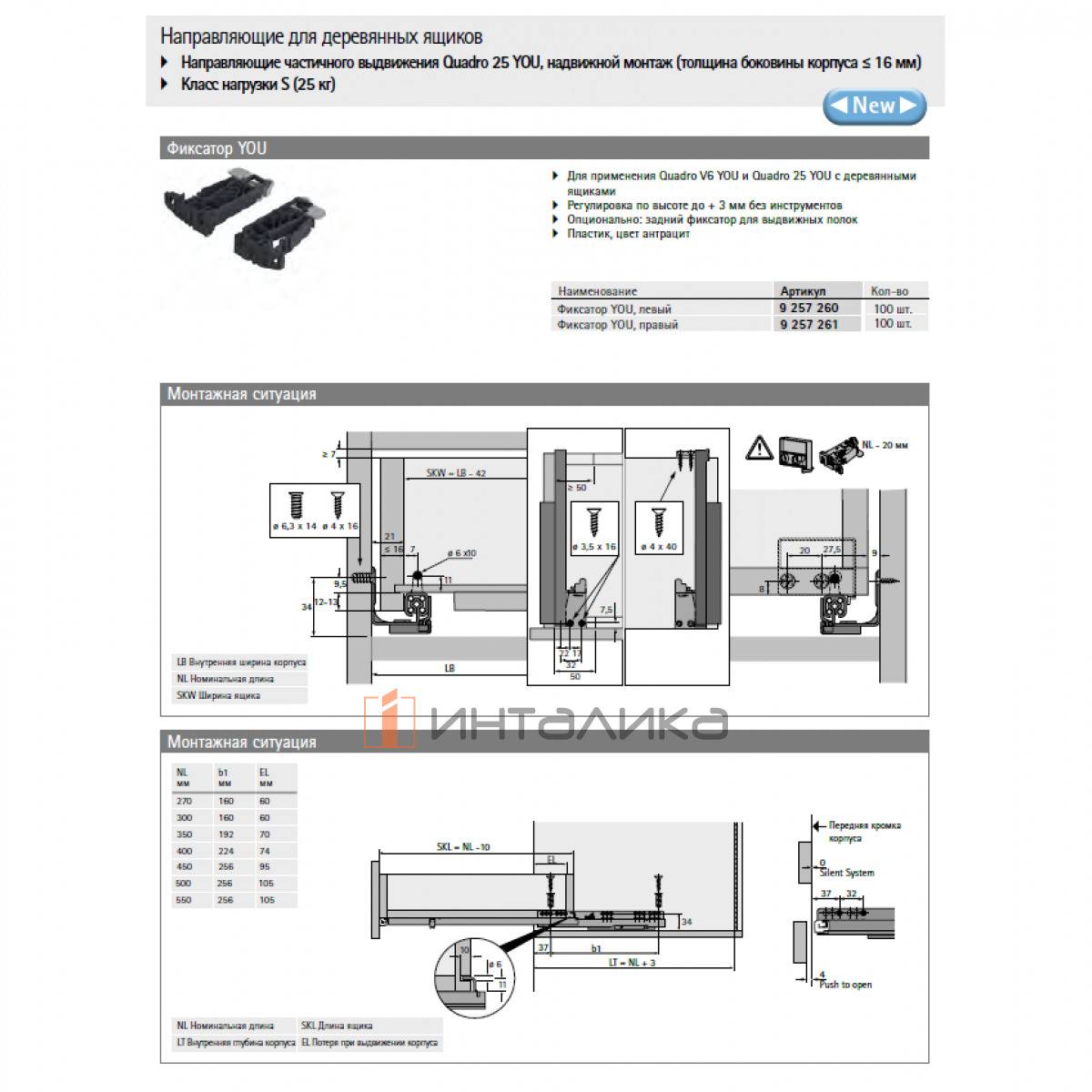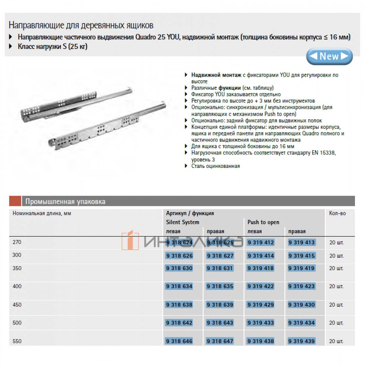 Направляющая HETTICH Quadro 25 S YOU, частичного выдвижения Push to open, EB21, NL450, G25, левая