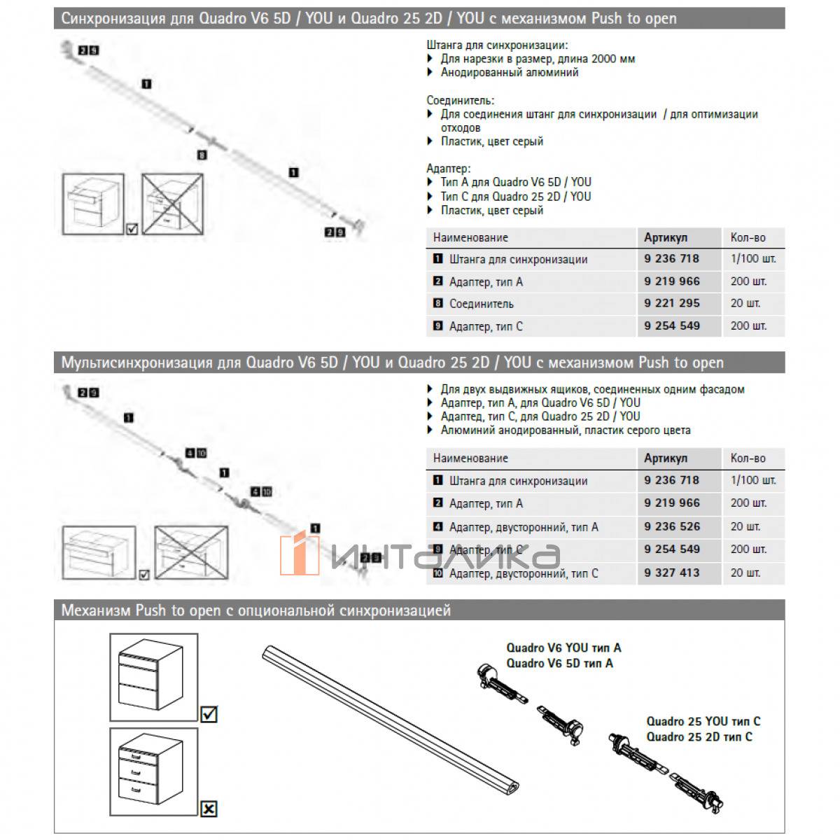 Примечание: синхронизация / мультисинхронизация для направляющих с механизмом Push to open в комплект не входит, приобретается отдельно