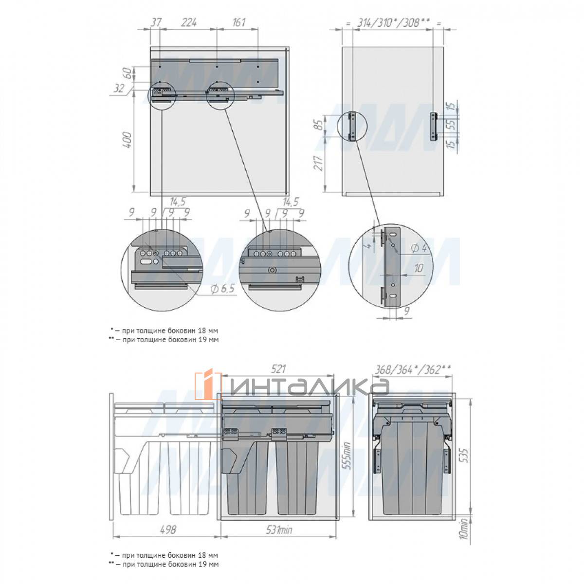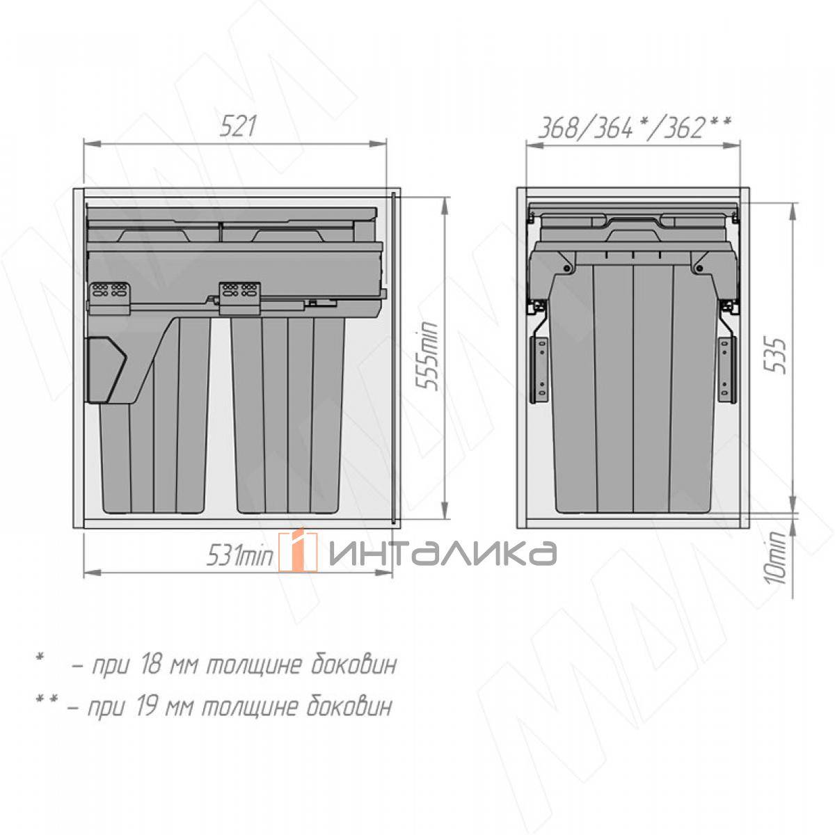 Комплектация: рама - 1 шт., боковины рамы - 2 шт., направляющие рамы - 1 компл., крепление фасада - 2 шт., ведро с ручками - 2 компл., заглушки креплений фасада - 2 шт., стационарная крышка-полка - 1 шт., боковины полки - 2 шт., противоскользящее покрытие - 1 шт., крепёж - 1 компл.