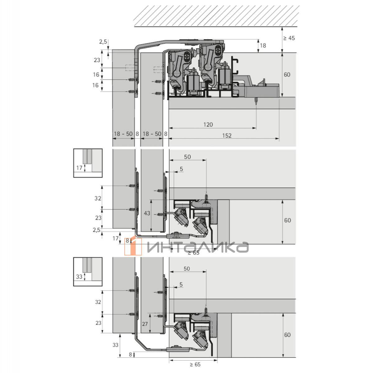 В комплект входят все необходимые элементы для мягкого бесшумного открывания и закрывания шкафов с раздвижными дверями