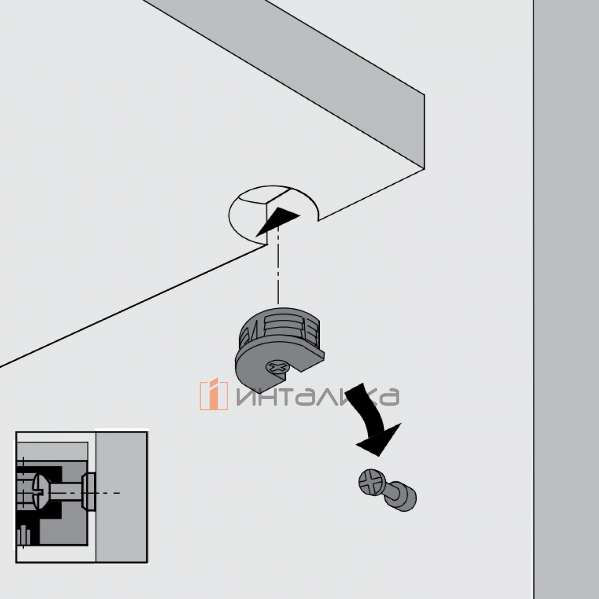 Эксцентриковая стяжка HETTICH VB35 обеспечивает надежное и прочное крепление полок с корпусом