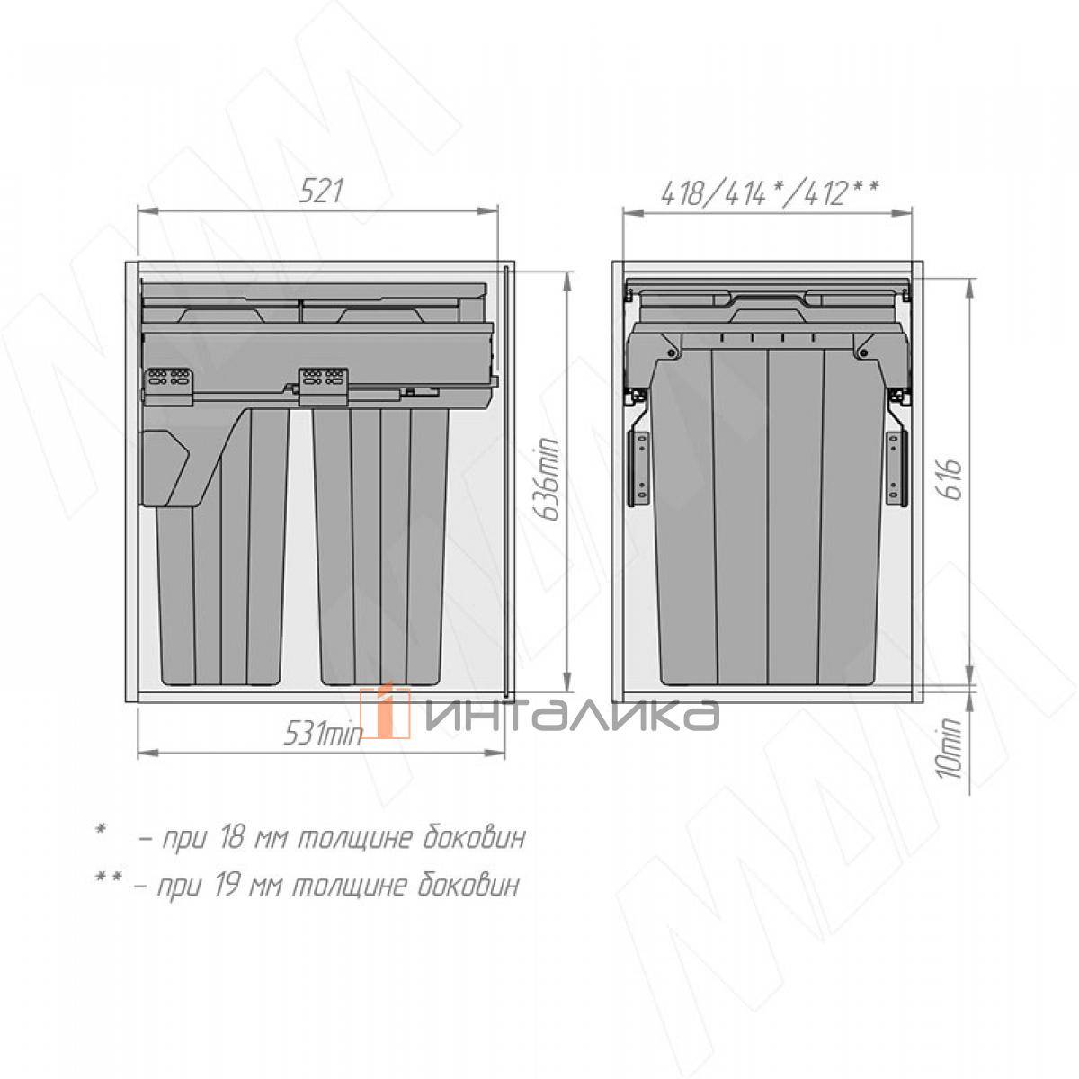 Комплектация: рама - 1 шт., боковины рамы - 2 шт., направляющие рамы - 1 компл., крепление фасада - 2 шт., ведро с ручками - 2 компл., заглушки креплений фасада - 2 шт., стационарная крышка-полка - 1 шт., боковины полки - 2 шт., противоскользящее покрытие - 1 шт., крепёж - 1 компл.