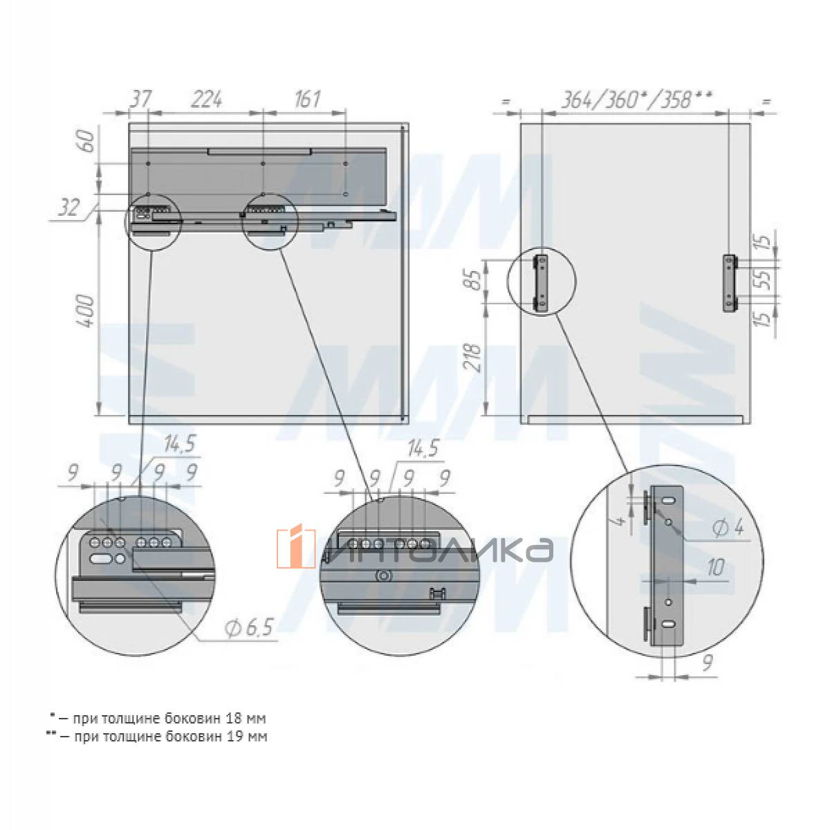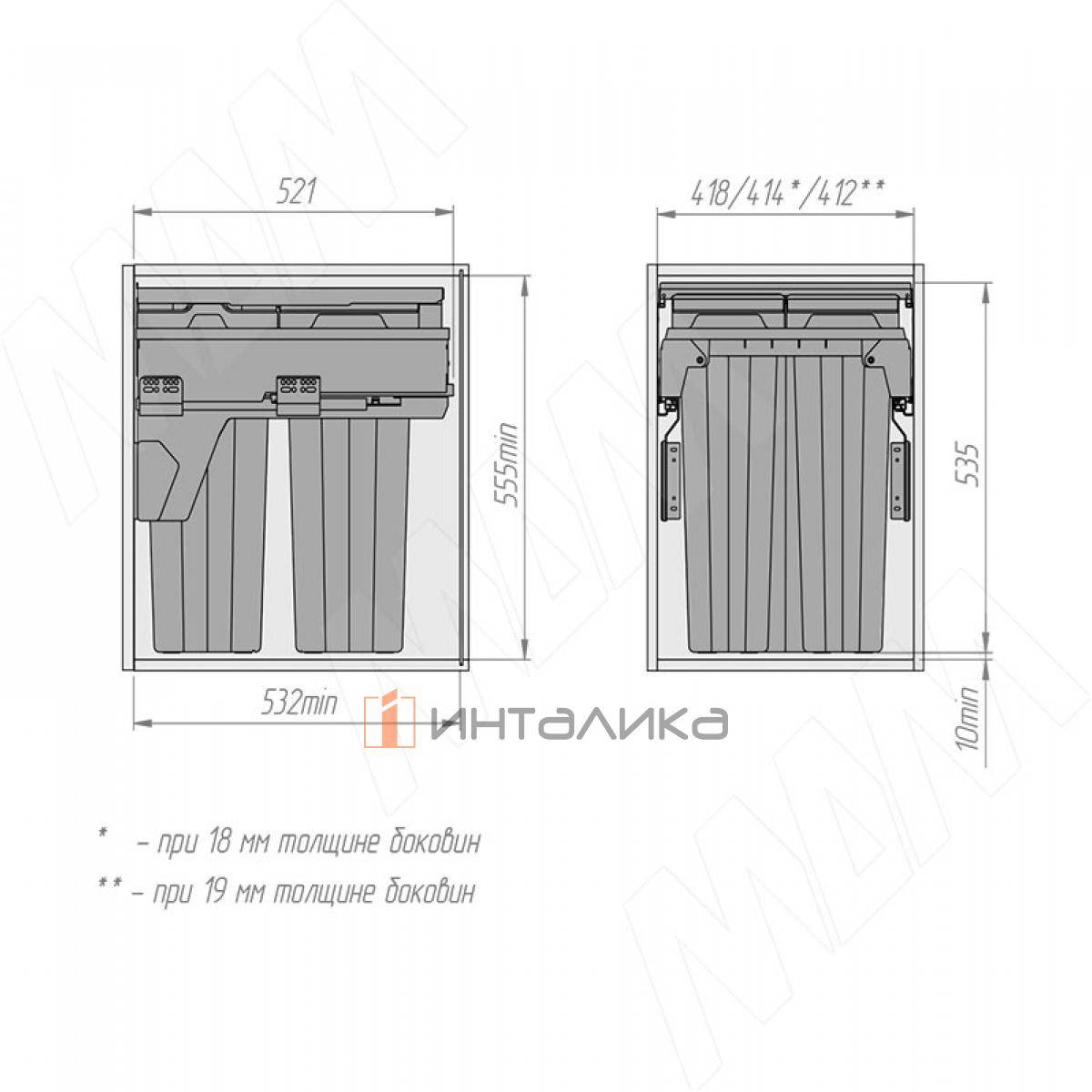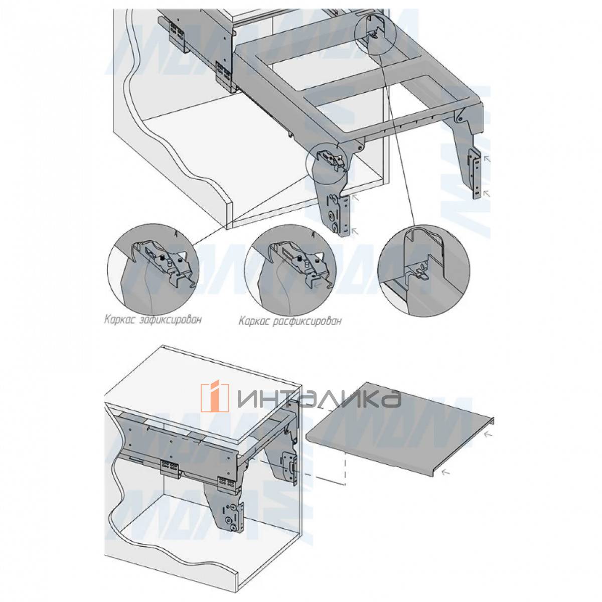 Комплектация: рама - 1 шт., боковины рамы - 2 шт., направляющие рамы - 1 компл., крепление фасада - 2 шт., ведро с ручками - 3 компл., заглушки креплений фасада - 2 шт., стационарная крышка-полка - 1 шт., боковины полки - 2 шт., противоскользящее покрытие - 1 шт., крепёж - 1 компл.