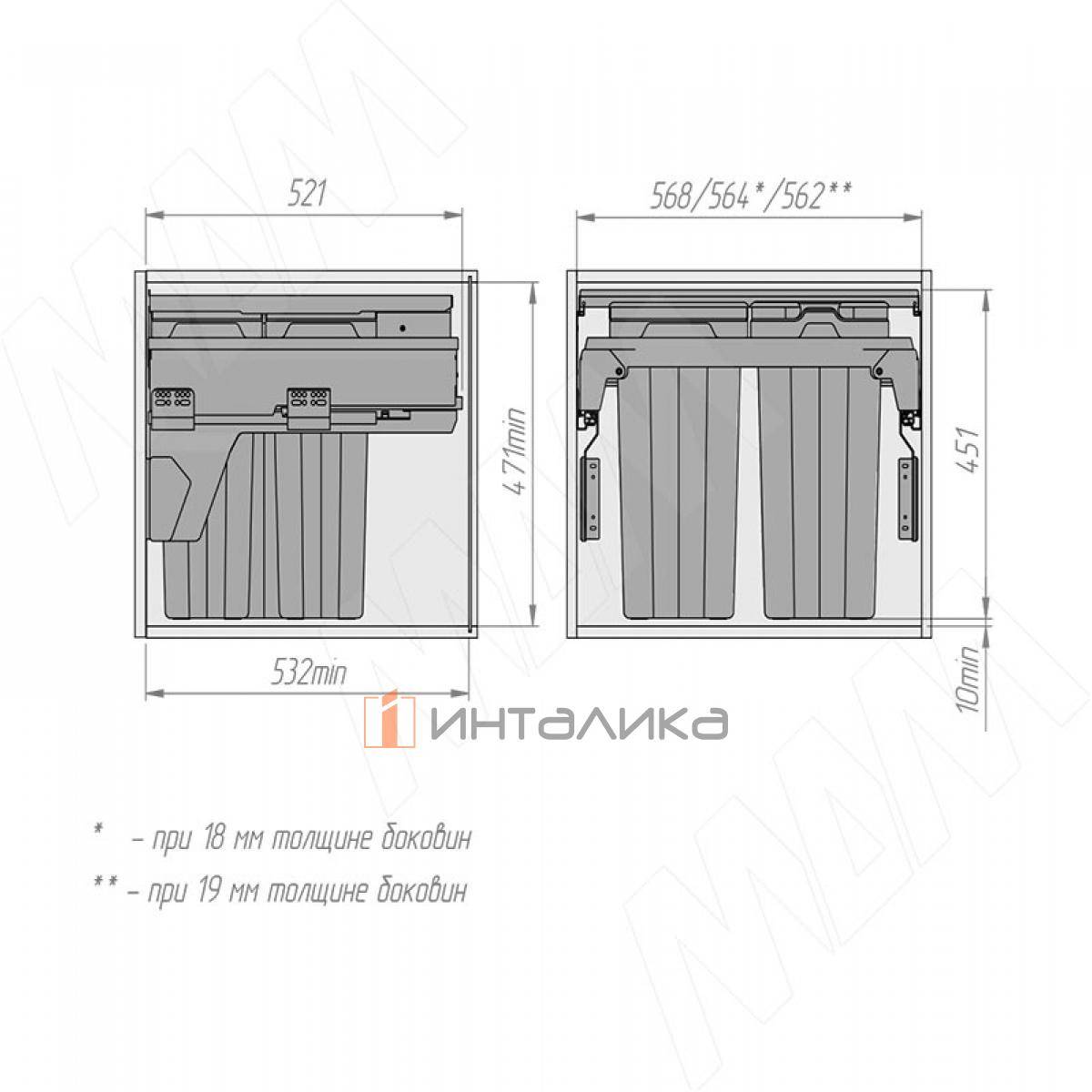 Комплектация: рама - 1 шт., боковины рамы - 2 шт., направляющие рамы - 1 компл., крепление фасада - 2 шт., ведро с ручками - 2 компл., заглушки креплений фасада - 2 шт., стационарная крышка-полка - 1 шт., боковины полки - 2 шт., противоскользящее покрытие - 1 шт., крепёж - 1 компл.