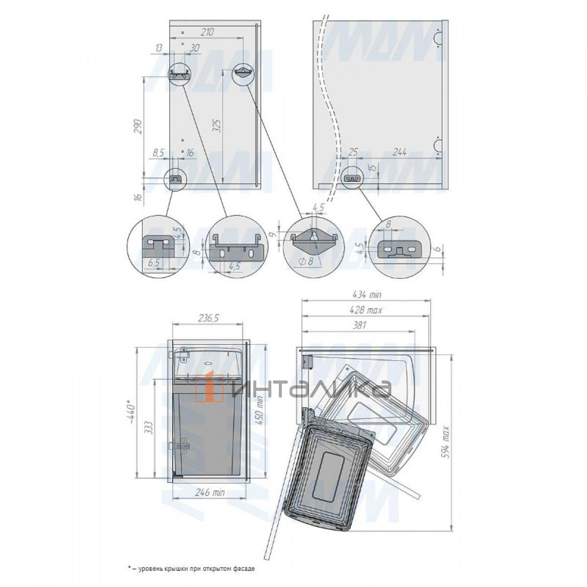 • используется с прямым или угловым корпусом с распашным фасадом;