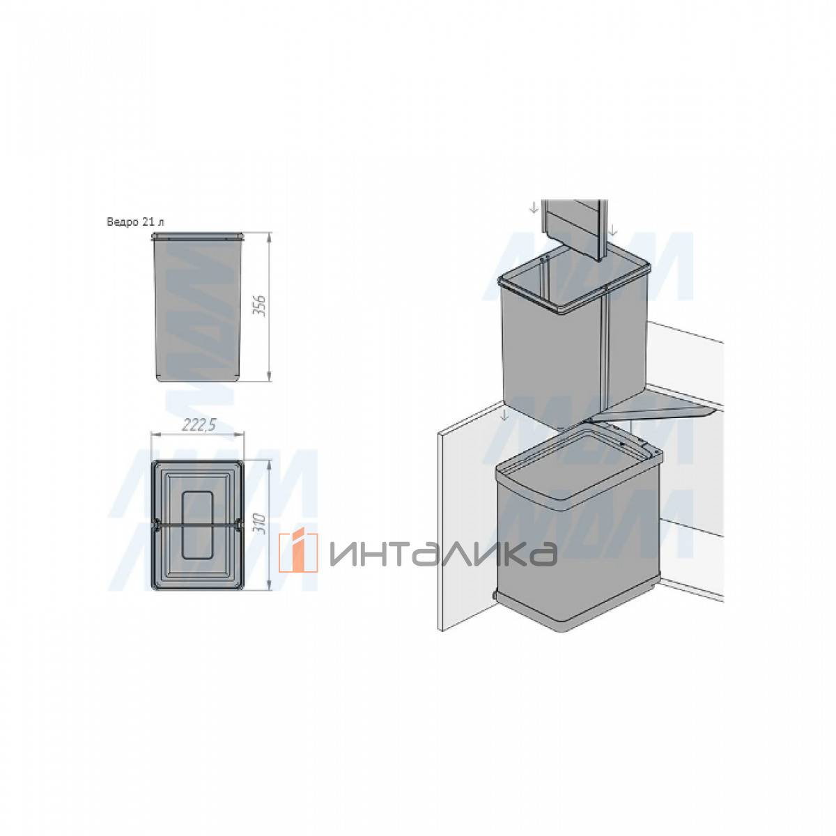 Комплектация: корпус в сборе - 1 шт., крышка - 1 шт., поводок крышки - 1 шт., элементы поворотного механизма - 1 компл., ведро с ручками - 1 компл., разделитель для ведра - 1 шт., крепёж