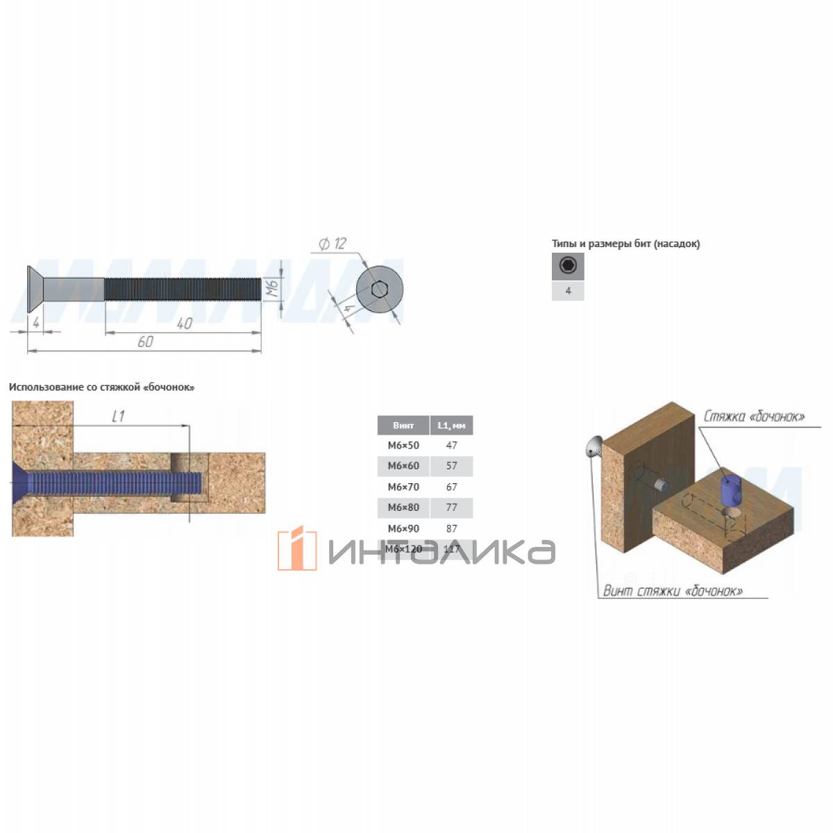 Винт с потайной головкой под шестигранник, M6 X 60, HXS M6 X60 MP