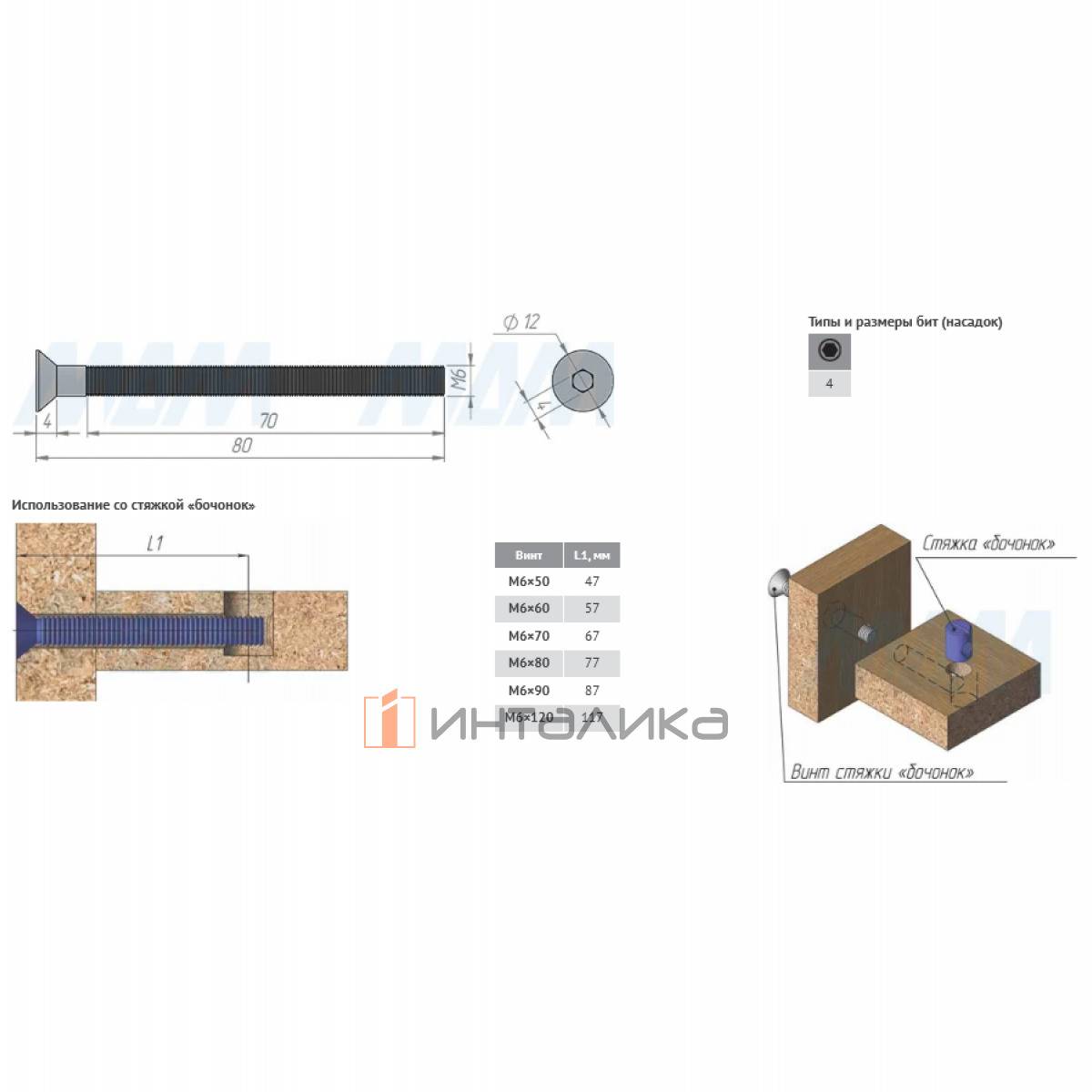 Винт с потайной головкой под шестигранник, M6 X 80, HXS M6 X80 MP