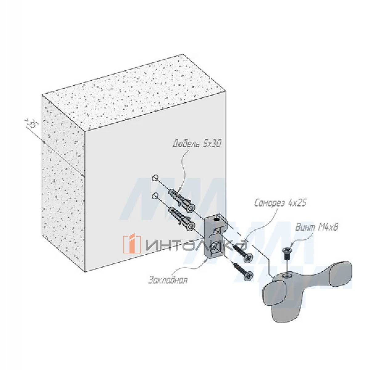 Комплектация: крючок, саморез 4×25 мм - 2 шт., дюбель 5×30 мм - 2 шт., винт установочный М4×8 мм - 1 шт., площадка (крепление к стене) - 1 шт.