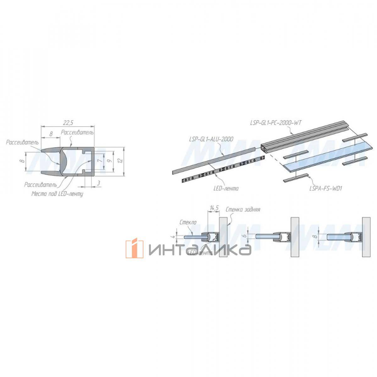 Применение: профиль для установки светодиодной ленты шириной до 8 мм для торцевой подсветки стеклянной полки толщиной до 8 мм