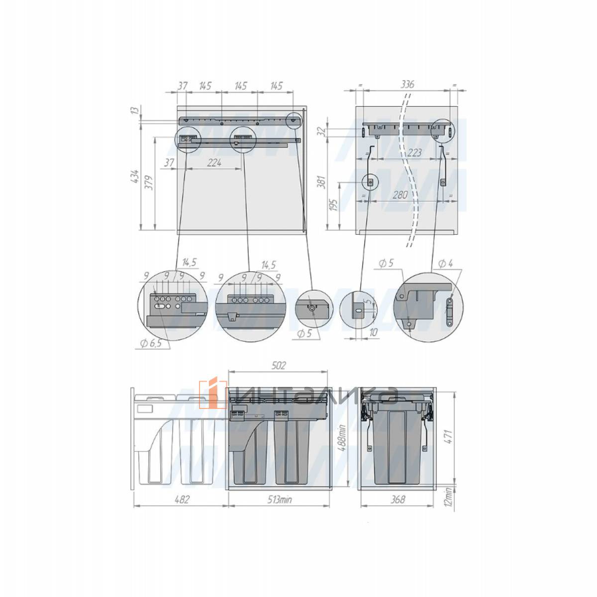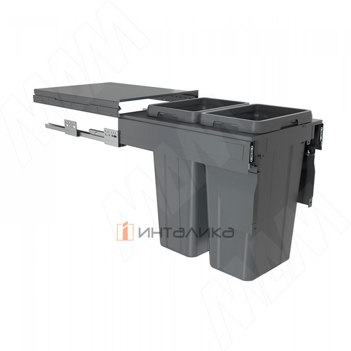 Комплектация: рама - 1 шт., боковины рамы - 2 шт., направляющие рамы - 1 компл., крепление фасада - 2 шт., ведро с рамкой для пакета и ручками - 2 компл., заглушки креплений фасада - 2 шт., стационарная крышка-полка - 1 шт., боковины полки - 2 шт., противоскользящее покрытие - 1 шт., крепёж - 1 кпл.